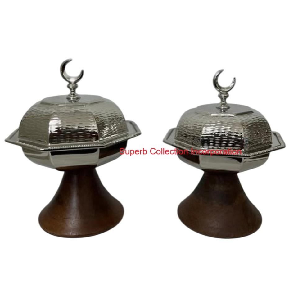 ชามโลหะสีทองพร้อมฝาปิดดีไซน์รูปดาวจันทร์เสี้ยวอิสลามทรงค้อนของขวัญหรูหราสำหรับตกแต่งบ้านจานเสิร์ฟ