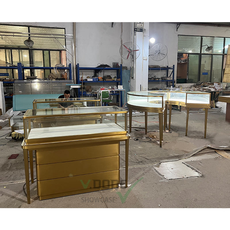ตู้โชว์เครื่องประดับโลหะสีทองสำหรับตู้เก็บหรือร้านเครื่องประดับการออกแบบตกแต่งภายในกรณีแสดงสินค้ากระจกเฟอร์นิเจอร์