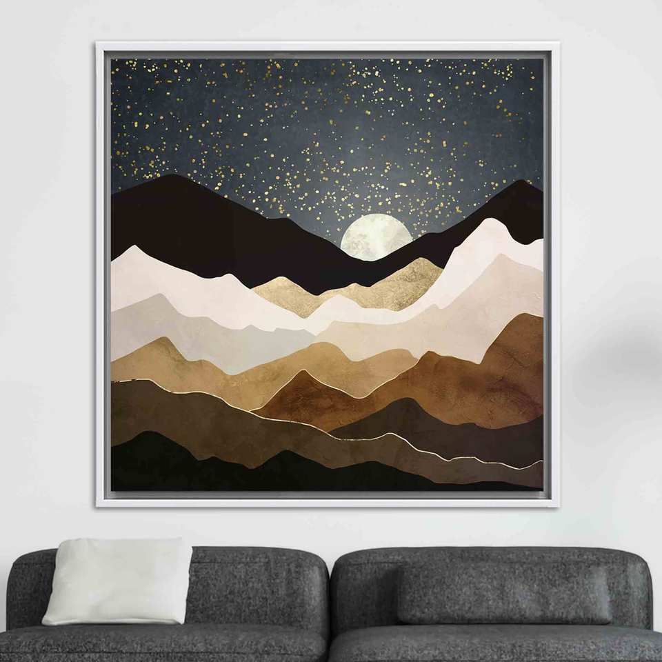 Golden Mountain Moon Landscape Printed Canvas Artwork, Elegant Wall Decor,Whte Framed Canvas