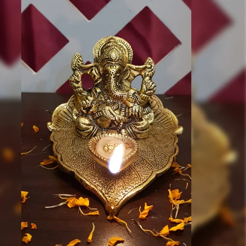 โกลเด้นออกซิไดซ์โบราณโลหะ Patta พระพิฆเนศกับ Deepak เชิงเทียนสําหรับตกแต่งเทียนตกแต่ง Diwali