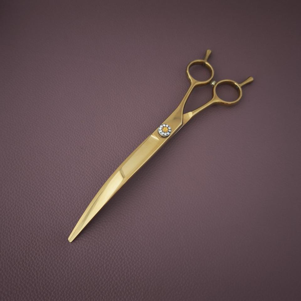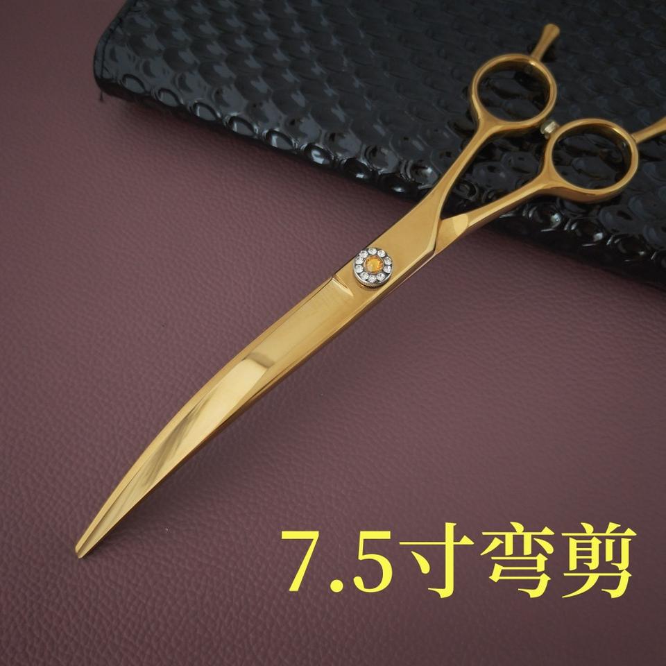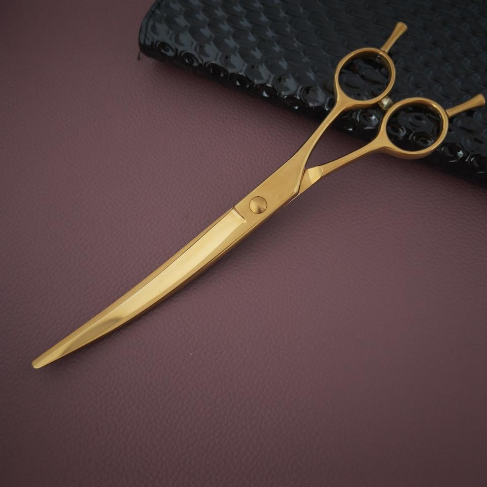 กรรไกรตัดผมระดับมืออาชีพสีทอง ขนาด 7.5 นิ้ว ใบมีดโค้งทำจากเหล็กกล้าไร้สนิม 440C คมกริบ ด้ามจับยาว สำหรับใช้ในร้านเสริมสวย