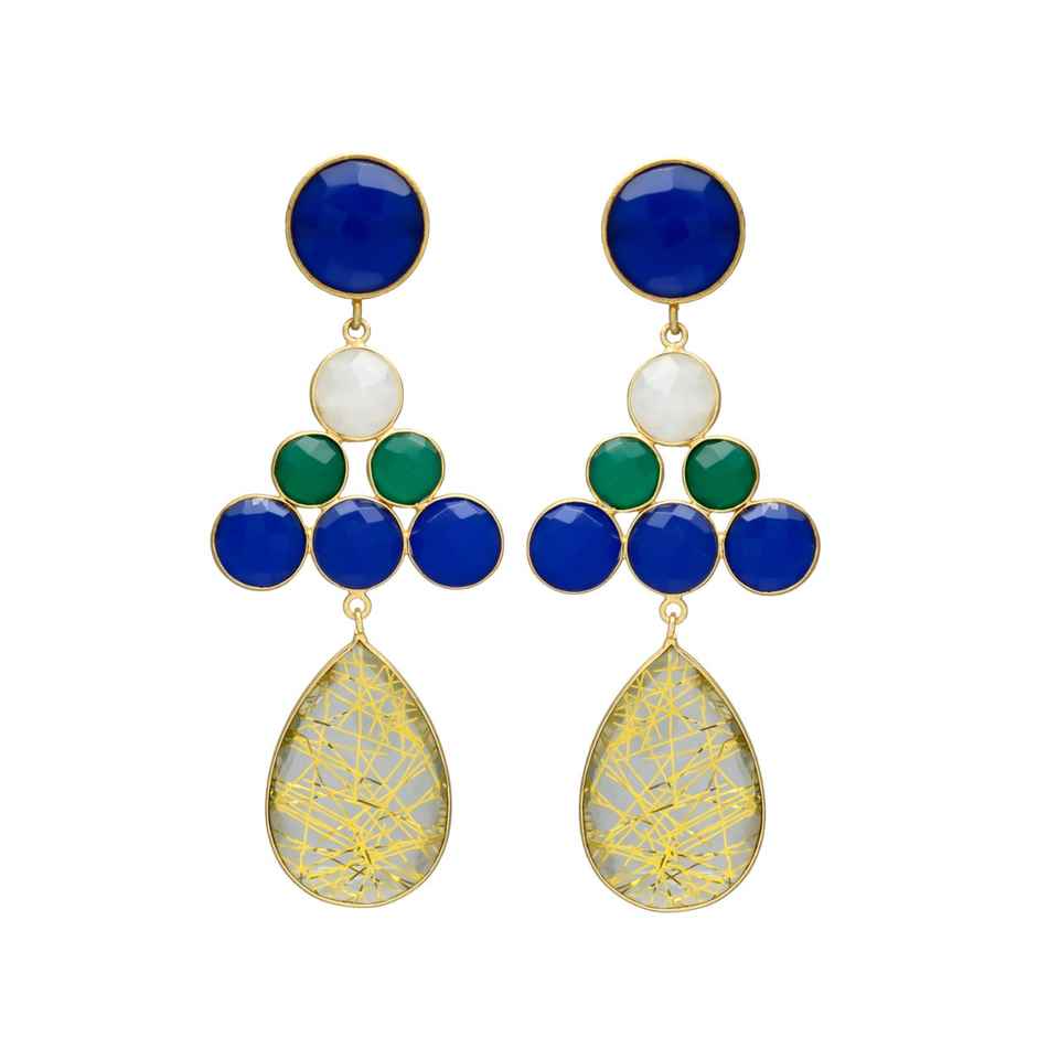 ต่างหูหยดน้ำพลอยทับทิมสีทองพร้อมต่างหูสตั๊ดน้ำไพลิน