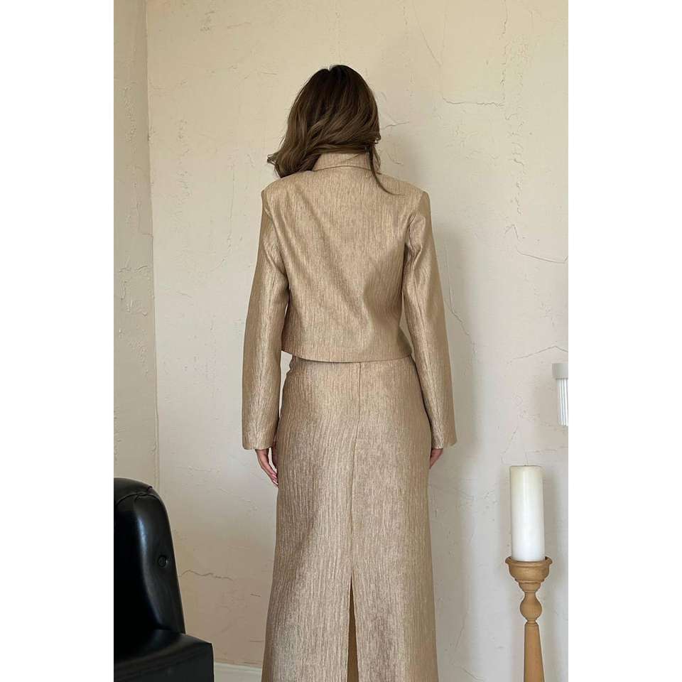 ชุดสูทผู้หญิงผ้าซาตินสีทอง กระโปรงยาวและเสื้อแจ็คเก็ต สวมใส่เป็นทางการ สไตล์หรูหรา
