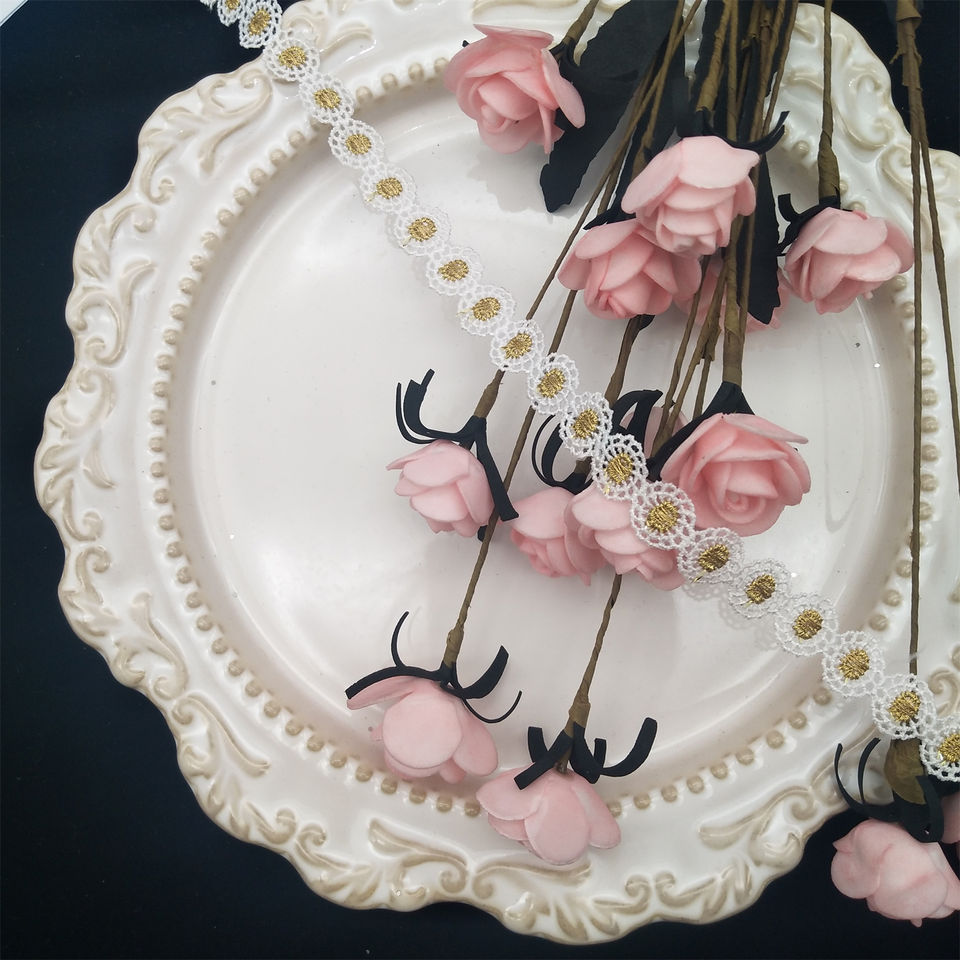 ลูกไม้ปักดิ้นไหมสีทอง 100% โพลีเอสเตอร์ ละลายน้ำได้ สำหรับงานสิ่งทอภายในบ้านและงานตกแต่ง ความกว้าง 1 ซม.