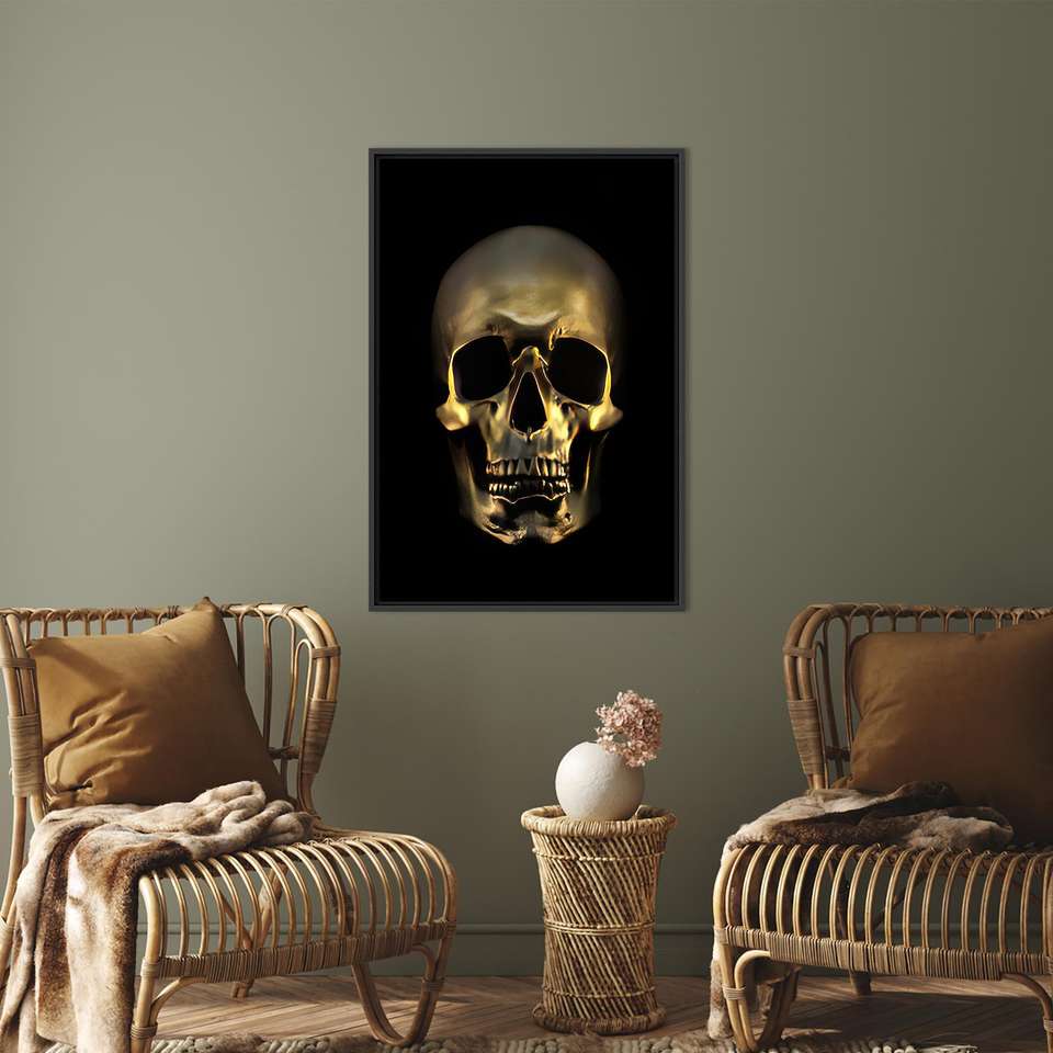 ผืนผ้าใบกระจกนิรภัยลายหัวกะโหลกสีทอง: งานศิลปะพิมพ์ลายฮาโลวีนสมัยใหม่ ผ้าใบกรอบสีดำ