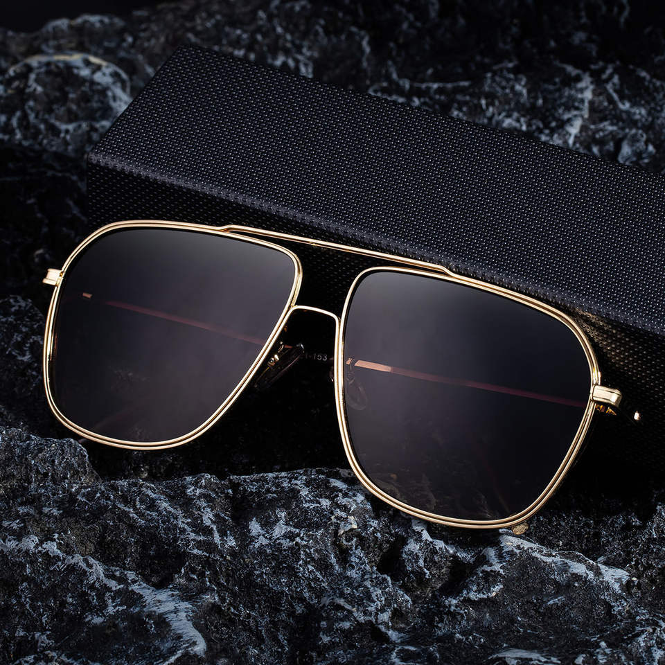 แว่นกันแดดกรอบสี่เหลี่ยมสีทองสำหรับผู้ชายสไตล์นักบินโลหะป้องกันรังสียูวี 400 คลาส 2 แว่นกันแดดกรอบพลาสติกและโลหะ