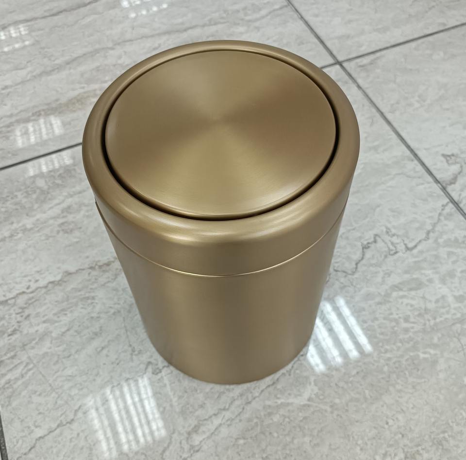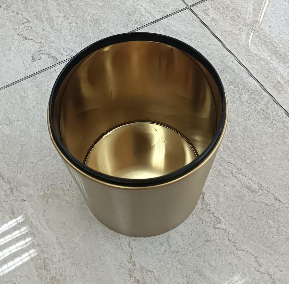 ถังขยะทรงกลมสีทอง ขนาดกะทัดรัด ทำจากสแตนเลส เหมาะสำหรับใช้ในห้องน้ำ ห้องครัว และโต๊ะทำงาน ผลิตด้วยมือจากอินเดีย