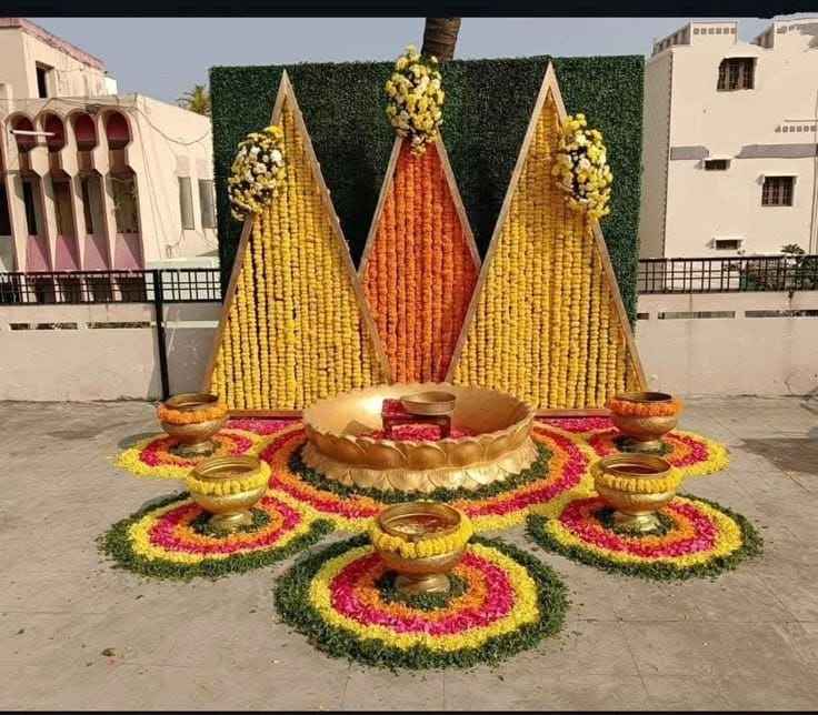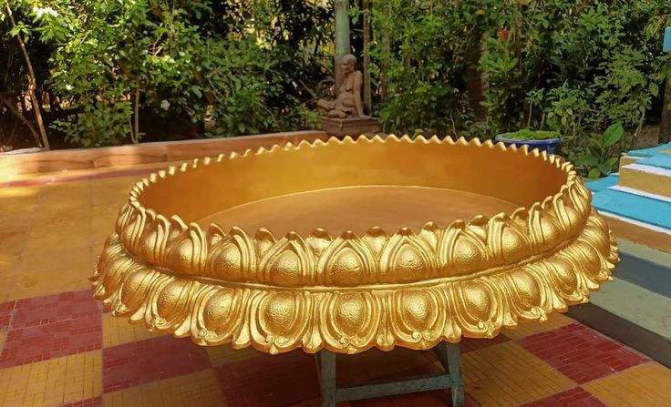 กระถางดอกบัวทรงโบราณสีทอง ขนาดเส้นผ่านศูนย์กลาง 5.5 ฟุต ทำจากไฟเบอร์ สำหรับพิธีฮัลดี