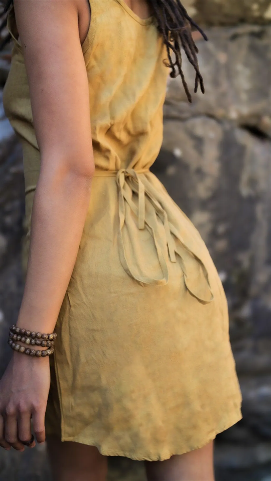 เดรสผ้าลินินโบโฮสีเหลืองทอง100% มินิเดรสแขนกุดผ้าฝ้ายสไตล์ลำลองระบายอากาศแฟชั่นเรียบง่ายสำหรับฤดูร้อน