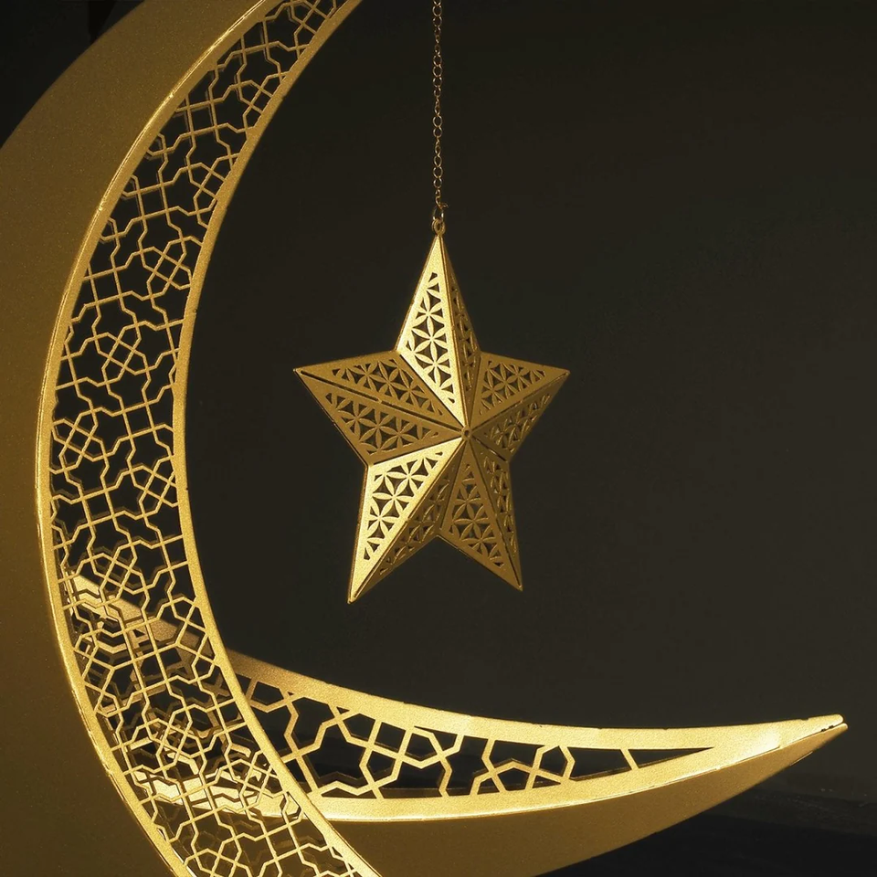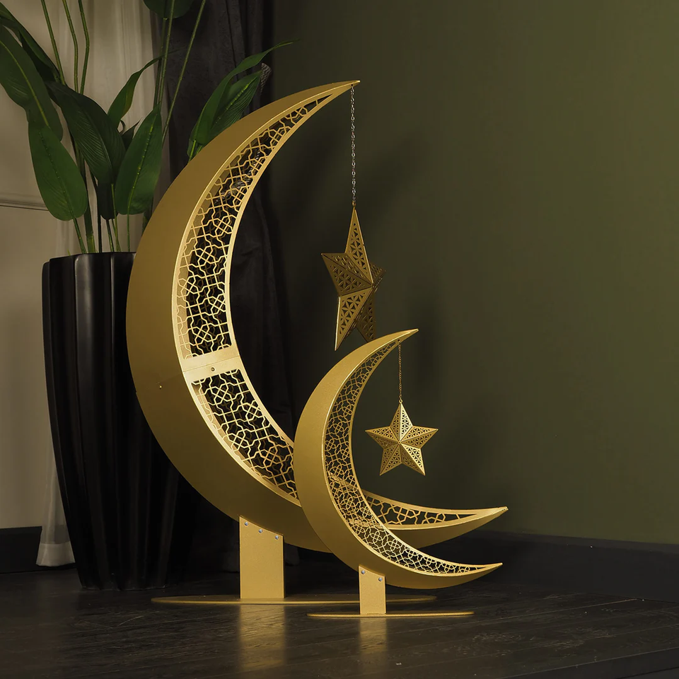 ของตกแต่งโต๊ะรูปพระจันทร์เสี้ยวสีทอง พร้อมดีไซน์ดาวแขวนแบบตัดด้วยเลเซอร์ สำหรับตกแต่งบ้านในเทศกาลและงานรอมฎอน อีด