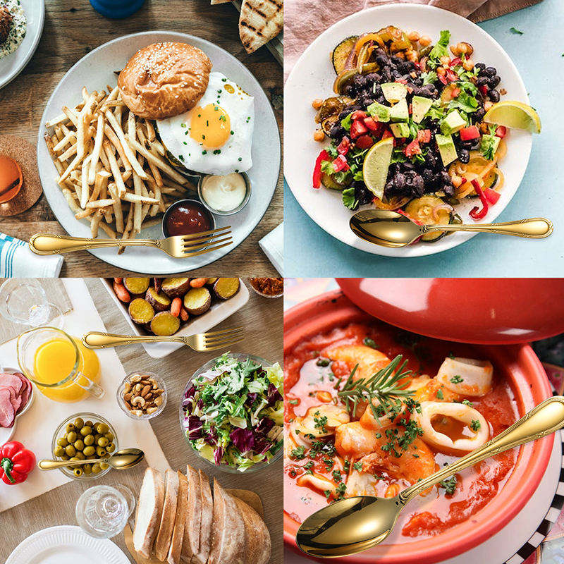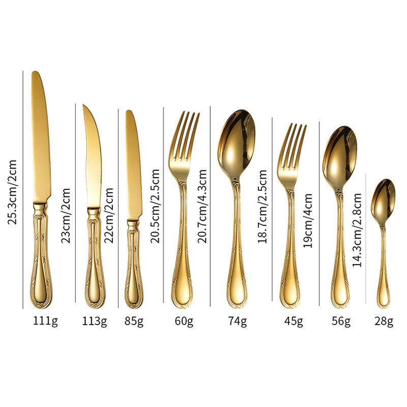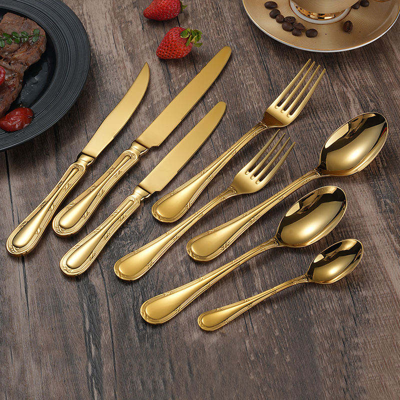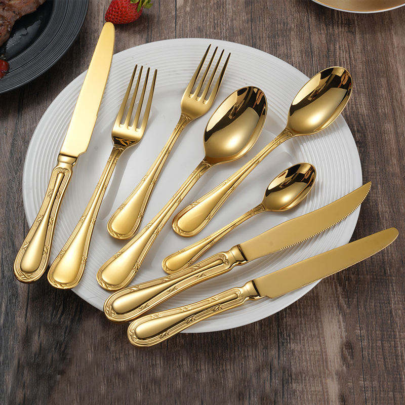 ชุดช้อนส้อมสแตนเลสสีทองสุดหรูเหมาะสำหรับใช้ในบ้านห้องครัวร้านอาหารการรับประทานอาหารของโรงแรมและการจัดวางโต๊ะในชีวิตประจำวัน