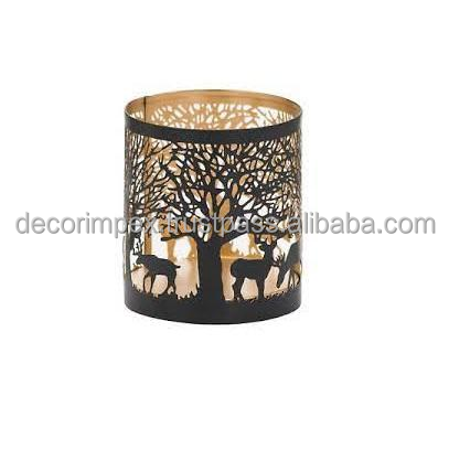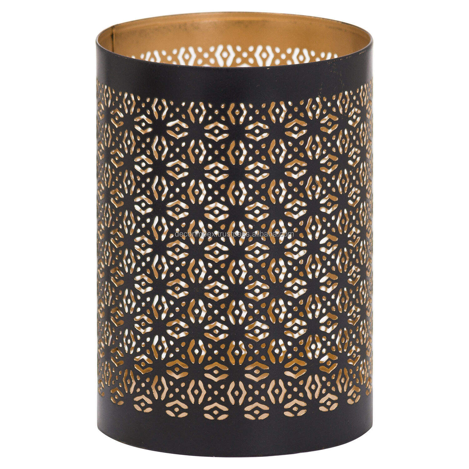 Golden finish metal votive holder with laser etched floral motifs designed for elegant candlelight and intimate by Decor impex