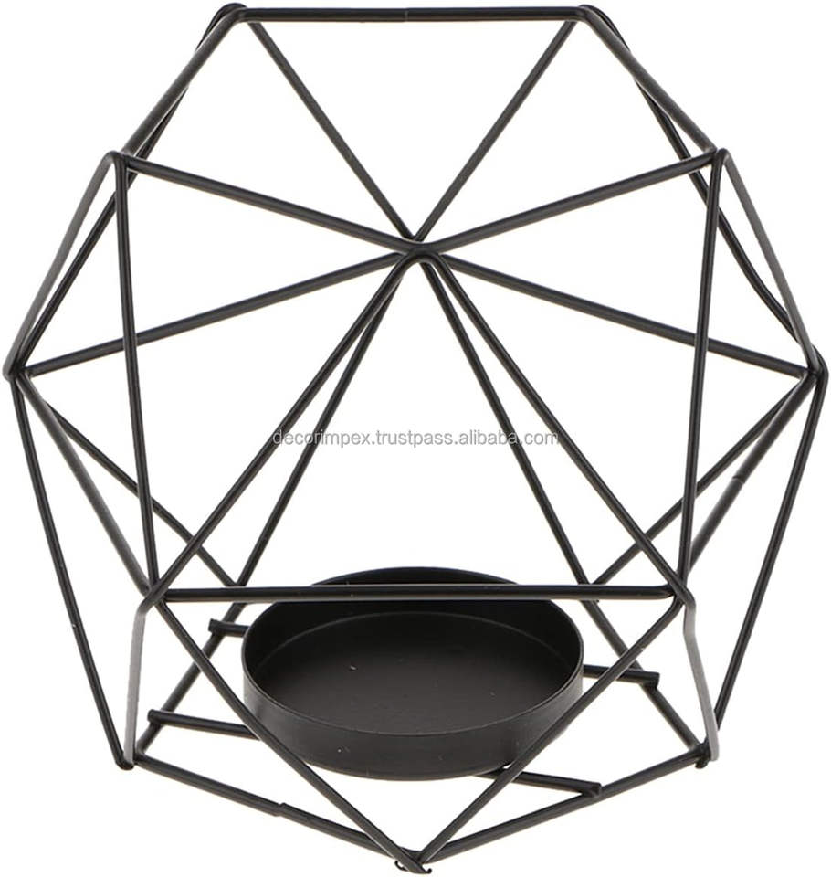 Golden metal candle holders designed in a wire cage style, each holding a pillar candle decor, and are also referred