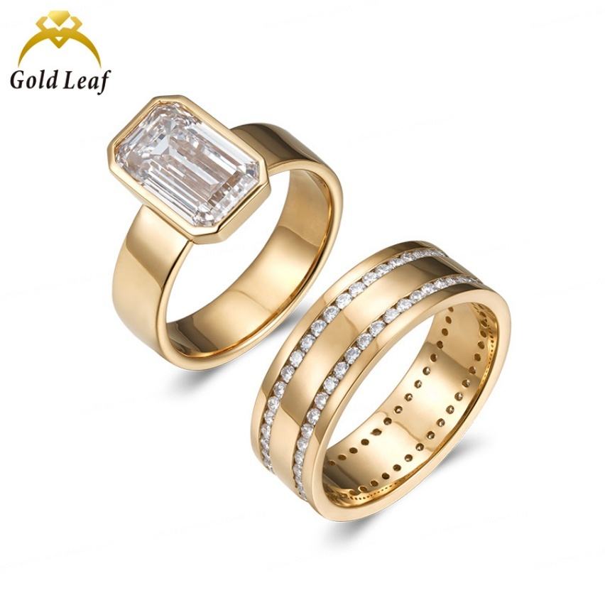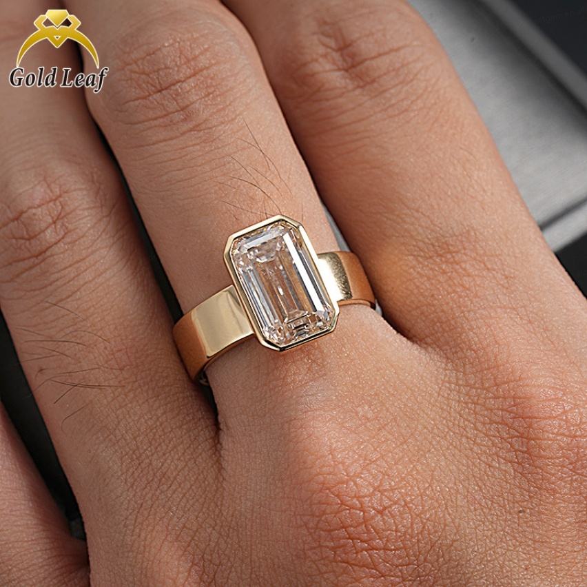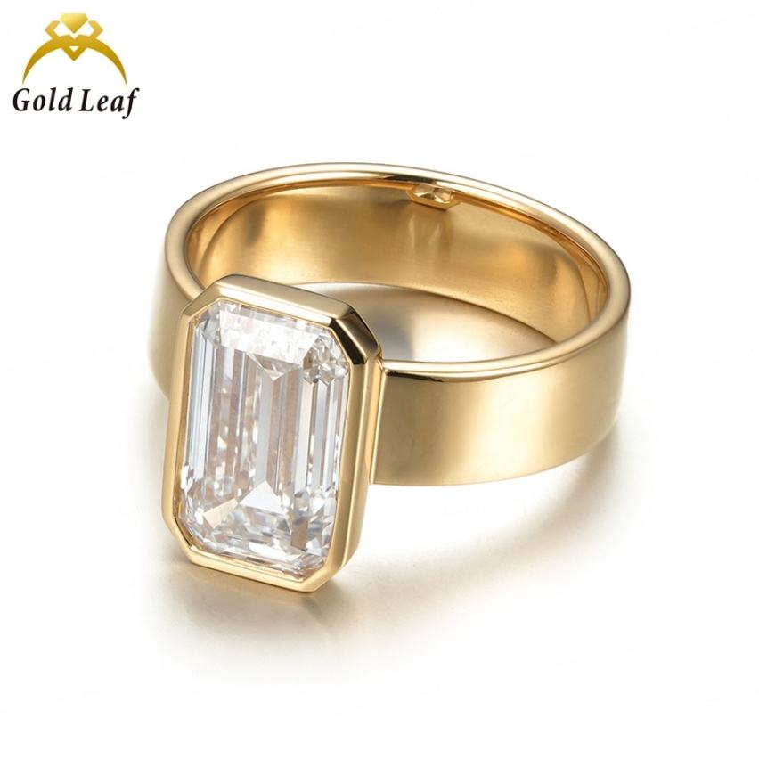 แหวนทองคำแท้ 10K 14K 18K สีเหลือง ประดับเพชรทรง Emerald Cut ขนาด 0.5-4 กะรัต เกรด F VVS สำหรับงานหมั้นและงานแต่งงาน แบรนด์ Goldleaf แหวนเพชรเพาะเลี้ยงสำหรับผู้ชาย