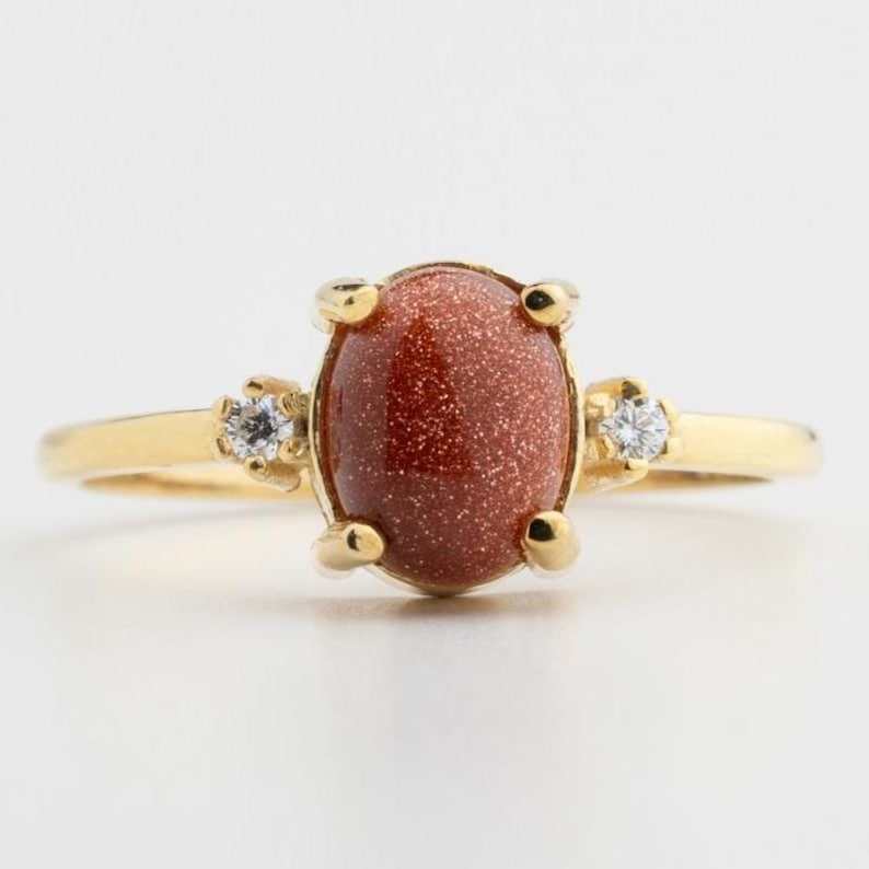 แหวนโกลด์สโตน เงินแท้ 925 ชุบทอง 14K เวอร์เมล ประดับพลอยรูปไข่ พร้อมเพชรเสริมประกาย ซันสโตน