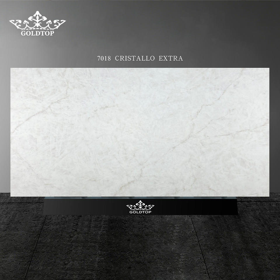 โกลด์ท็อป 7018 คริสตาลโล เอ็กซ์ตร้า พีดี หินสังเคราะห์สีขาว ลายควอตซ์ ดีไซน์หรูหราทันสมัย แผ่นใหญ่ ขัดเงา สำหรับเคาน์เตอร์โรงแรม