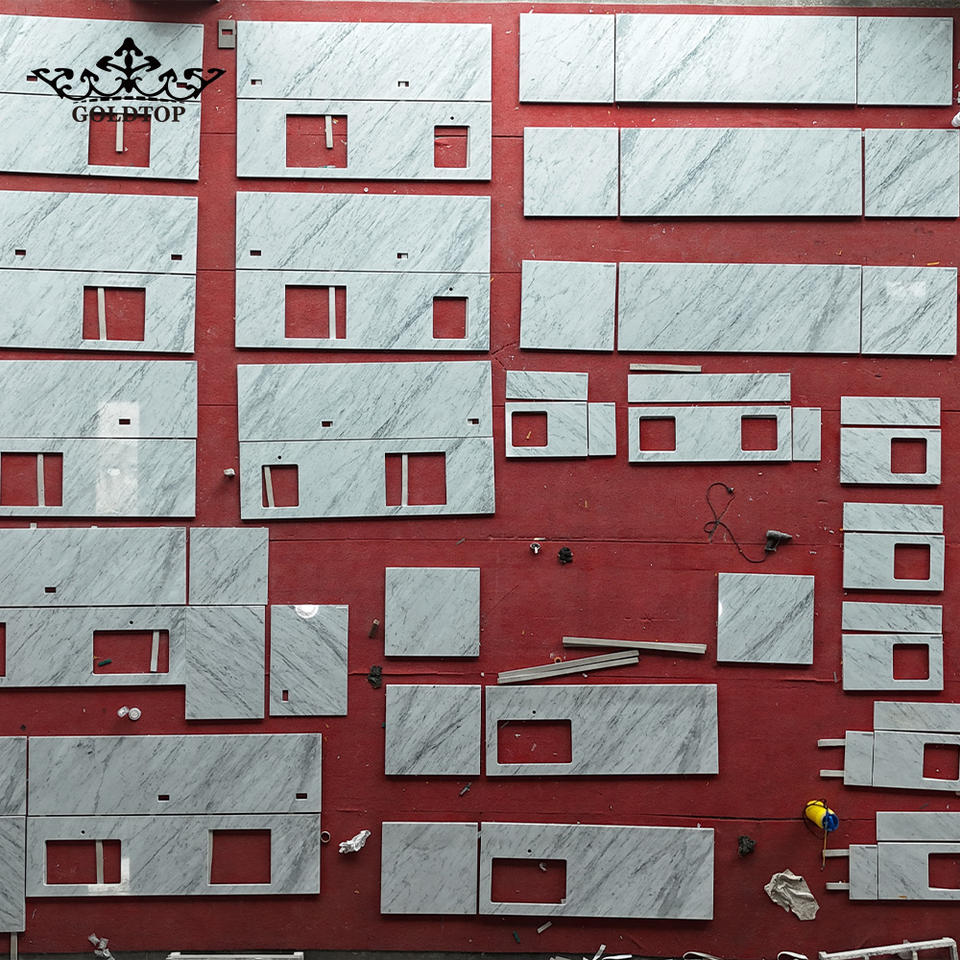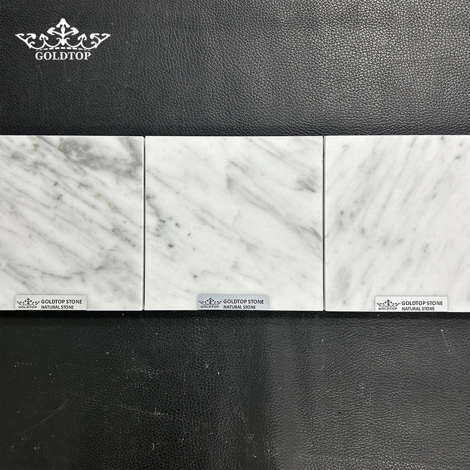 หินอ่อนคาร์ราร่าสีขาวขัดเงา Goldtop แบบ ODM/OEM ตัดตามขนาดทันสมัยสำหรับเคาน์เตอร์โรงแรม ผนัง และกระเบื้องปูพื้น