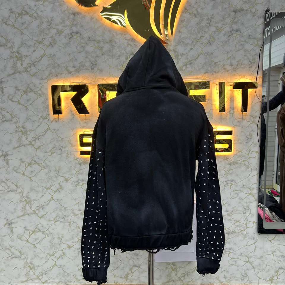 เสื้อฮู้ดดี้ผ้าฟลีซสไตล์สตรีทแวร์สำหรับผู้ชาย ซิปคุณภาพพรีเมียม แต่งคริสตัล ลุคย้อนยุค ซิปแบบดึงขึ้น ล้างสีแบบ Acid Wash