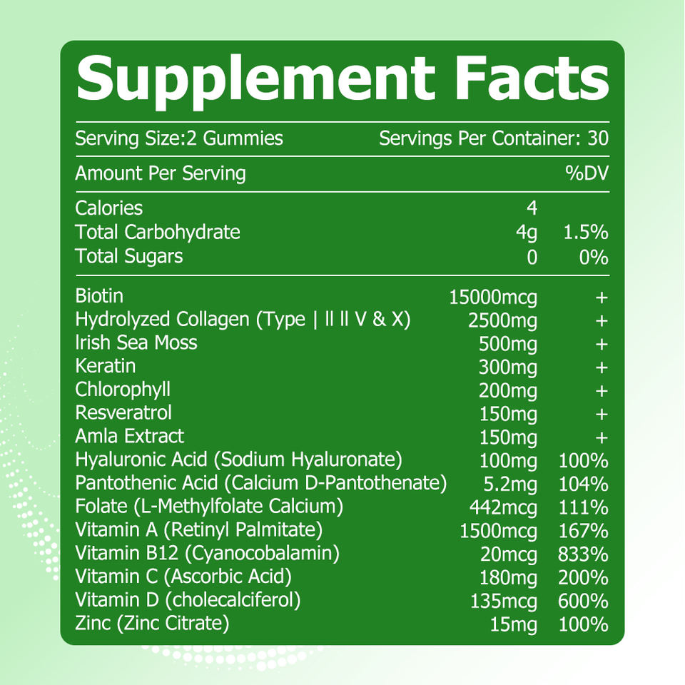 ส่วนผสมหลัก:ไบโอติน, คอลลาเจนไฮโดรไลซ์, มอสทะเลไอริช, คลอโรฟิลล์, สารสกัด Amla, เรสเวอราทรอล, วิตามินเอ, วิตามิน B12, วิตามินซี, วิตามินดี, สังกะสี, เคราติน