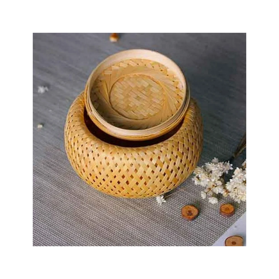กล่องของขวัญฝาตะกร้าขนาดเล็กทำจากไม้ไผ่ทอมือเป็นมิตรกับสิ่งแวดล้อมของผู้ผลิตในเวียดนามสำหรับเก็บกระถางดอกไม้หม้อชากระป๋อง