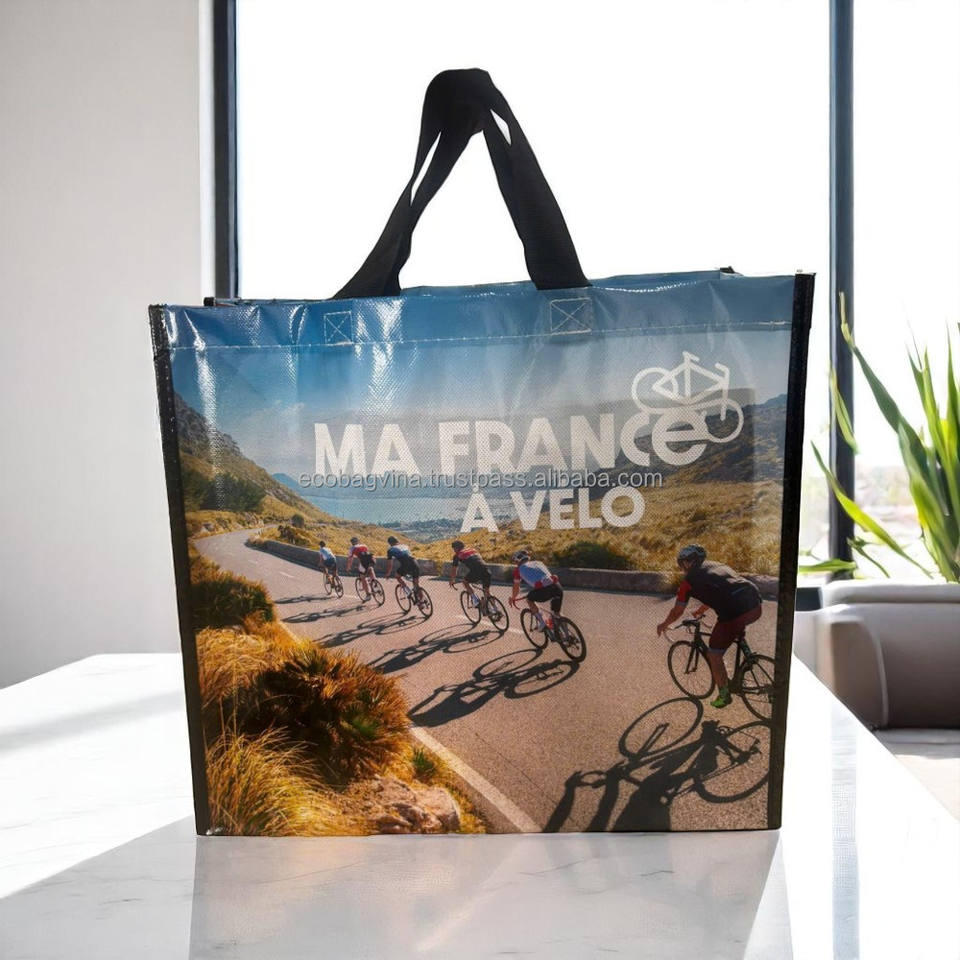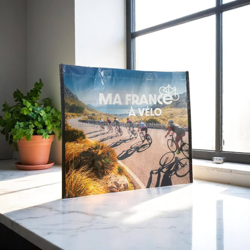 RPET กระเป๋าโท้ทขนาดกลางแบบนำกลับมาใช้ใหม่ได้สะดวกสายสะพายไหล่ด้ามจับแบบกำหนดเองพิมพ์ลามิเนตทั้งสองด้านสำหรับช้อปปิ้ง