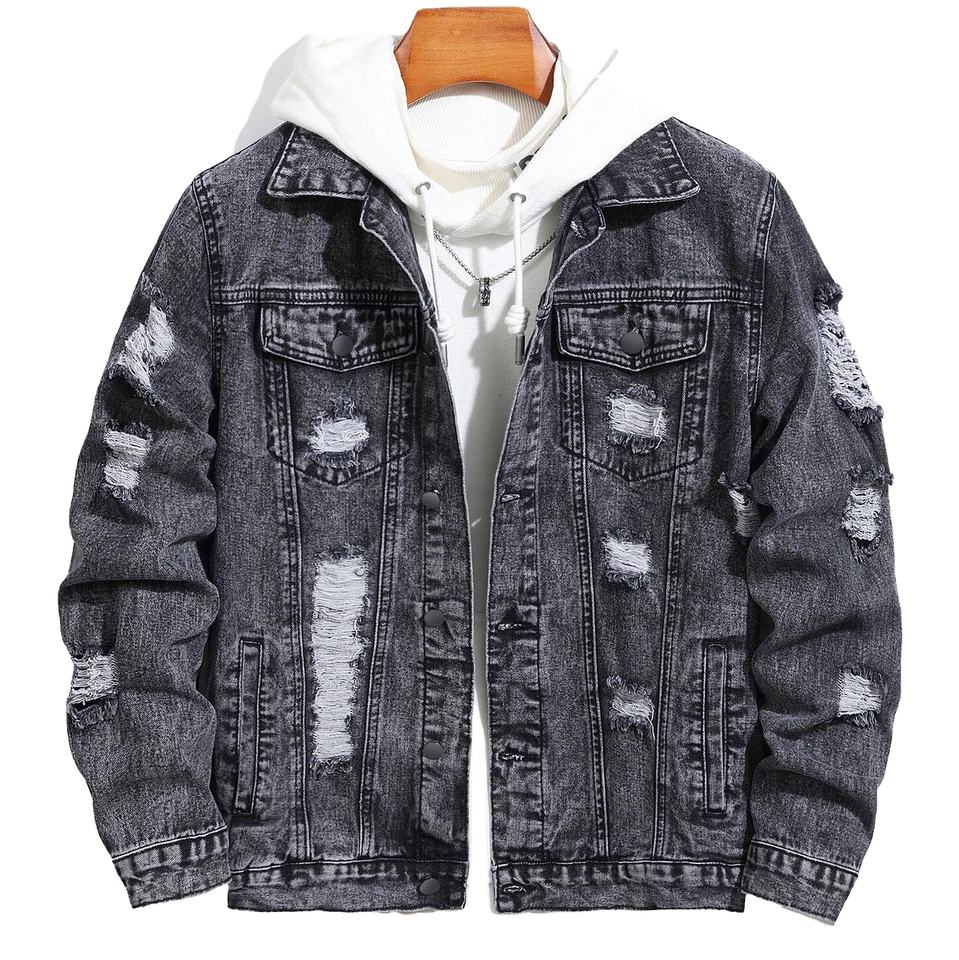 แจ็คเก็ตยีนส์แขนยาวทรงสลิมคุณภาพดีสำหรับผู้ชาย สไตล์ไบค์เกอร์ขาดๆ แบบคลาสสิก วินเทจ สีน้ำเงิน OEM 2026