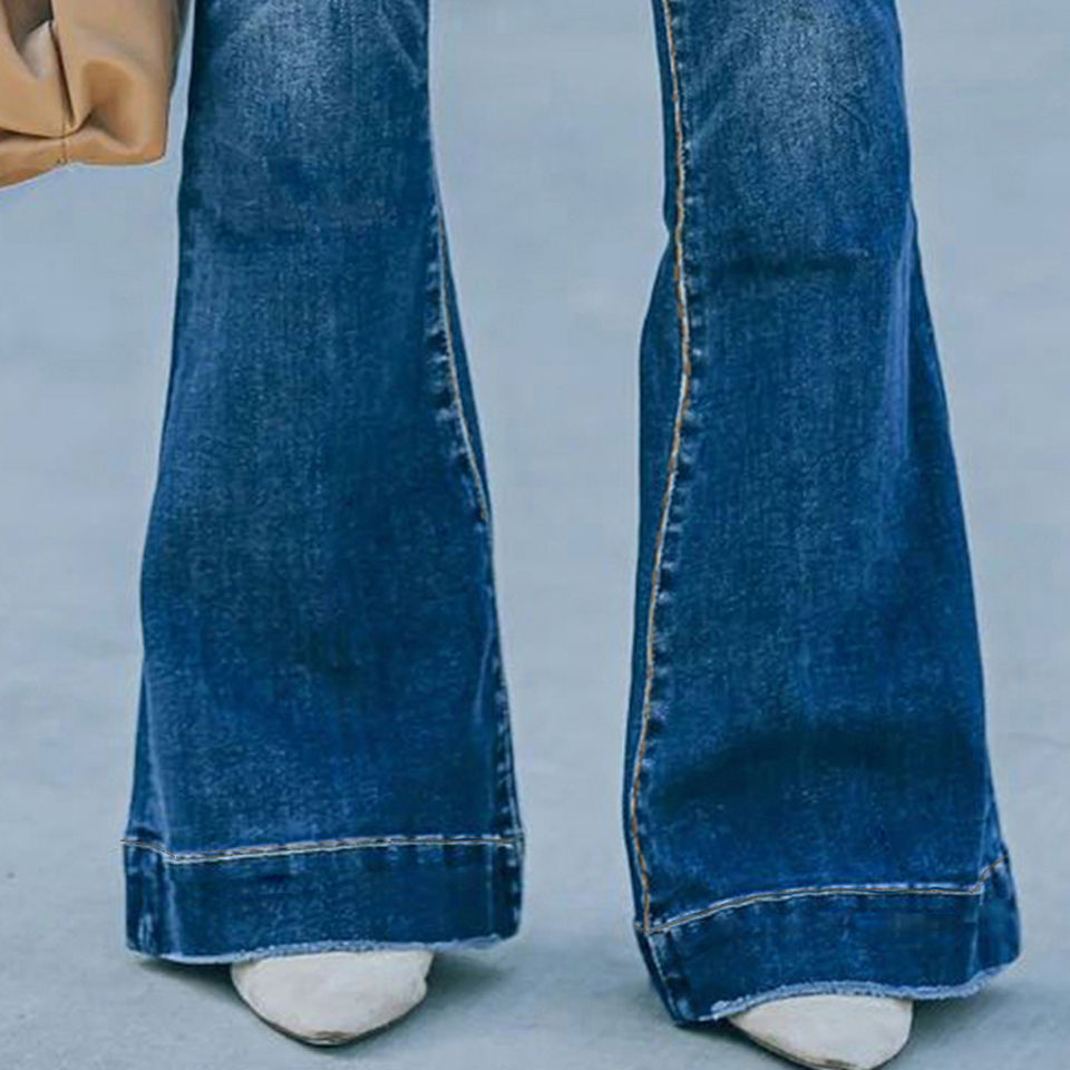 กางเกงขาบานขายาวและกว้างพร้อมโลโก้ระบายอากาศที่เอวกางเกงยีนส์สีน้ำเงินเข้มสำหรับผู้หญิง