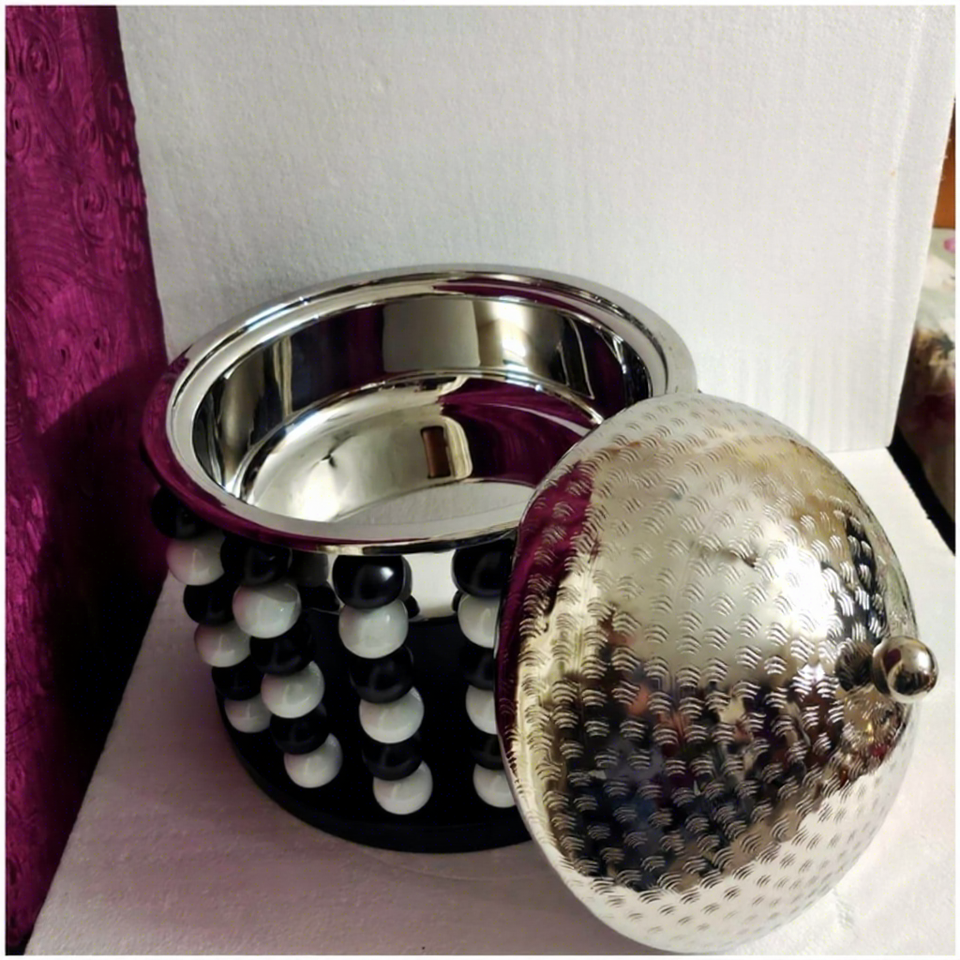 หม้อตุ๋นโลหะคุณภาพดีพร้อมหูจับสแตนเลส ฝาปิดสีขาวดำแบบรักษ์โลก ดีไซน์ทันสมัยสำหรับครัวเรือน