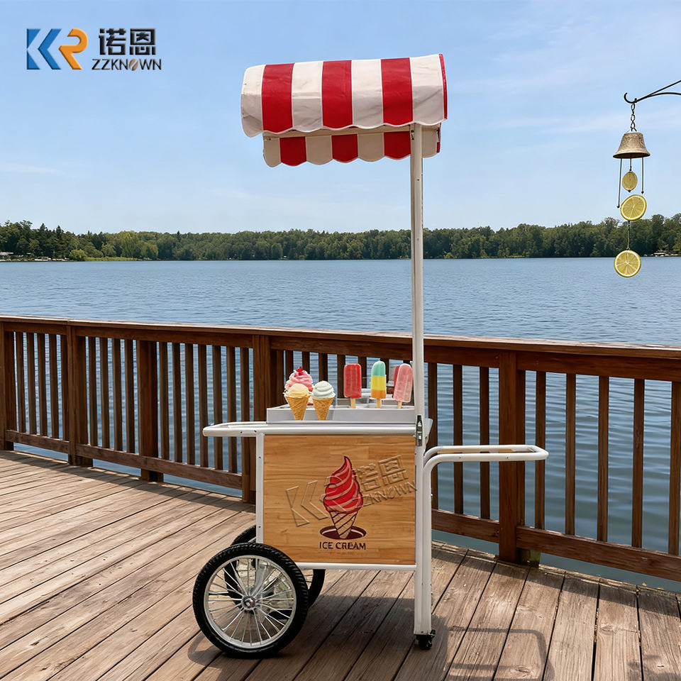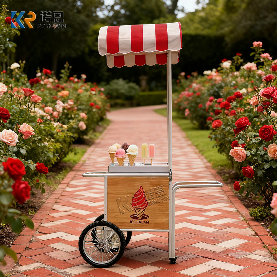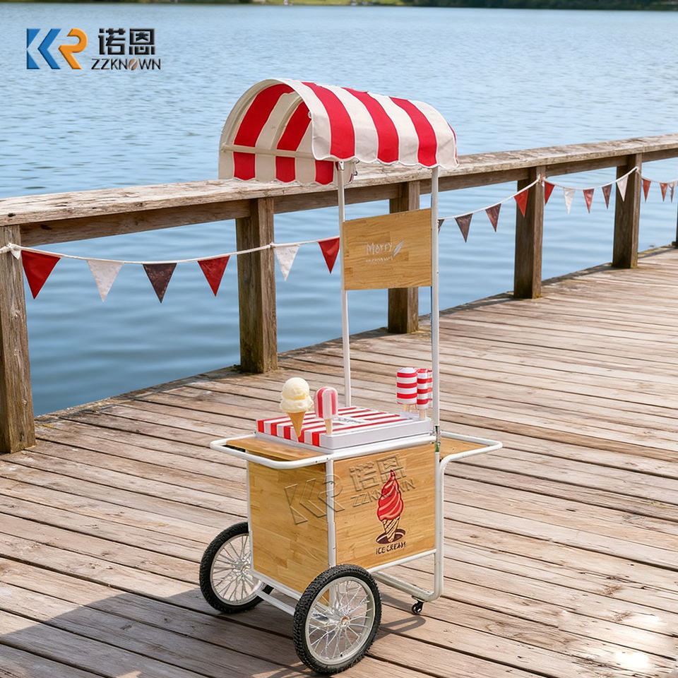 รถเข็นขายไอศกรีมแบบเข็นมือคุณภาพดีสำหรับใช้งานกลางแจ้ง พร้อมรถเข็นไฟฟ้าแบบถอดได้