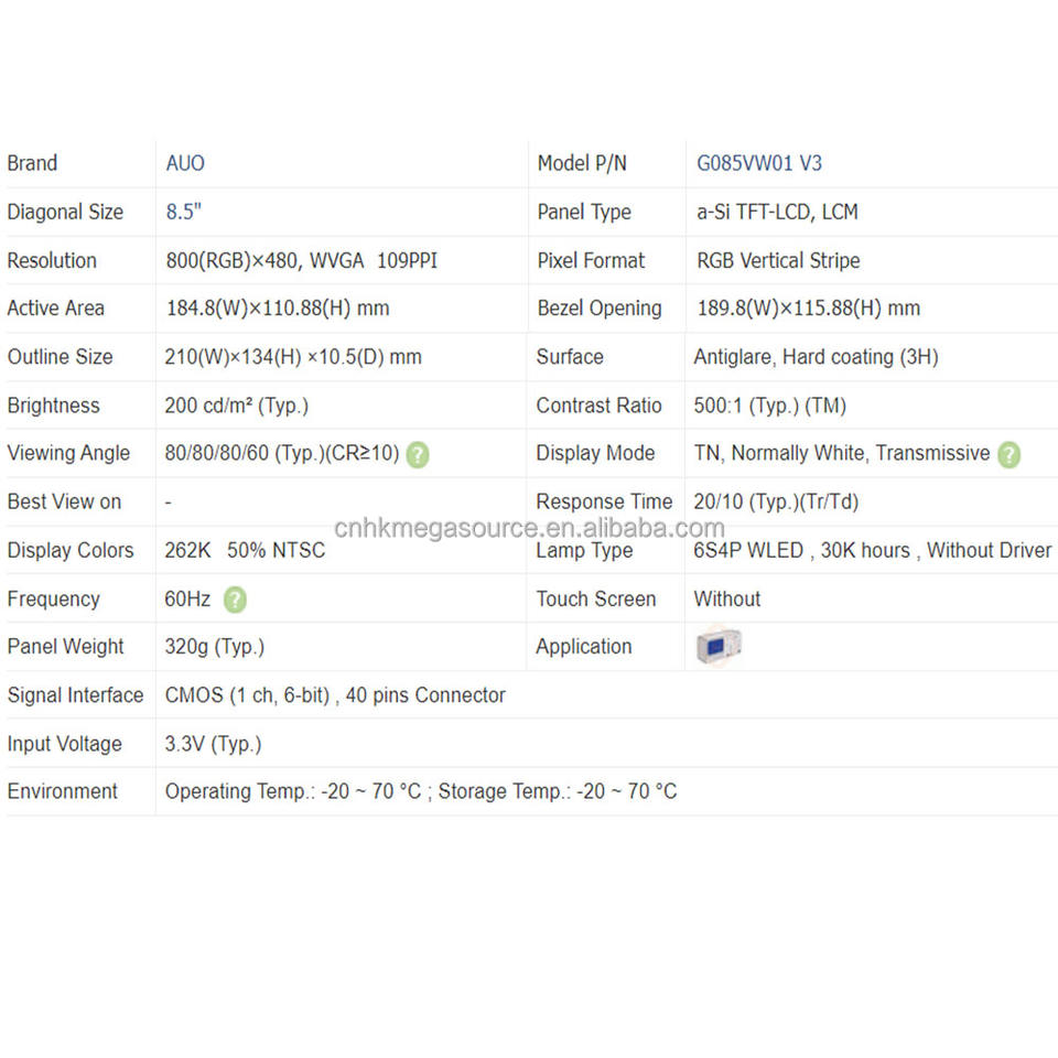 จอ LCD TFT ขนาด8.5นิ้ว800*480แผงแสดงผล LCD G085VW01 V3