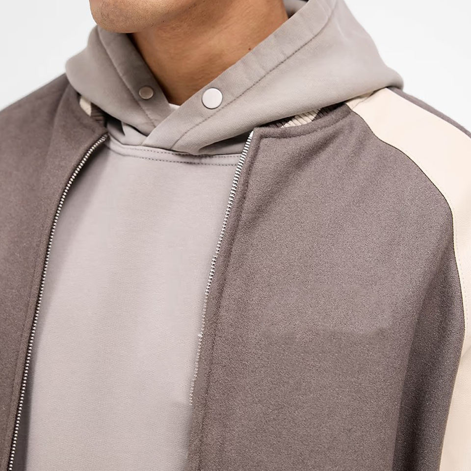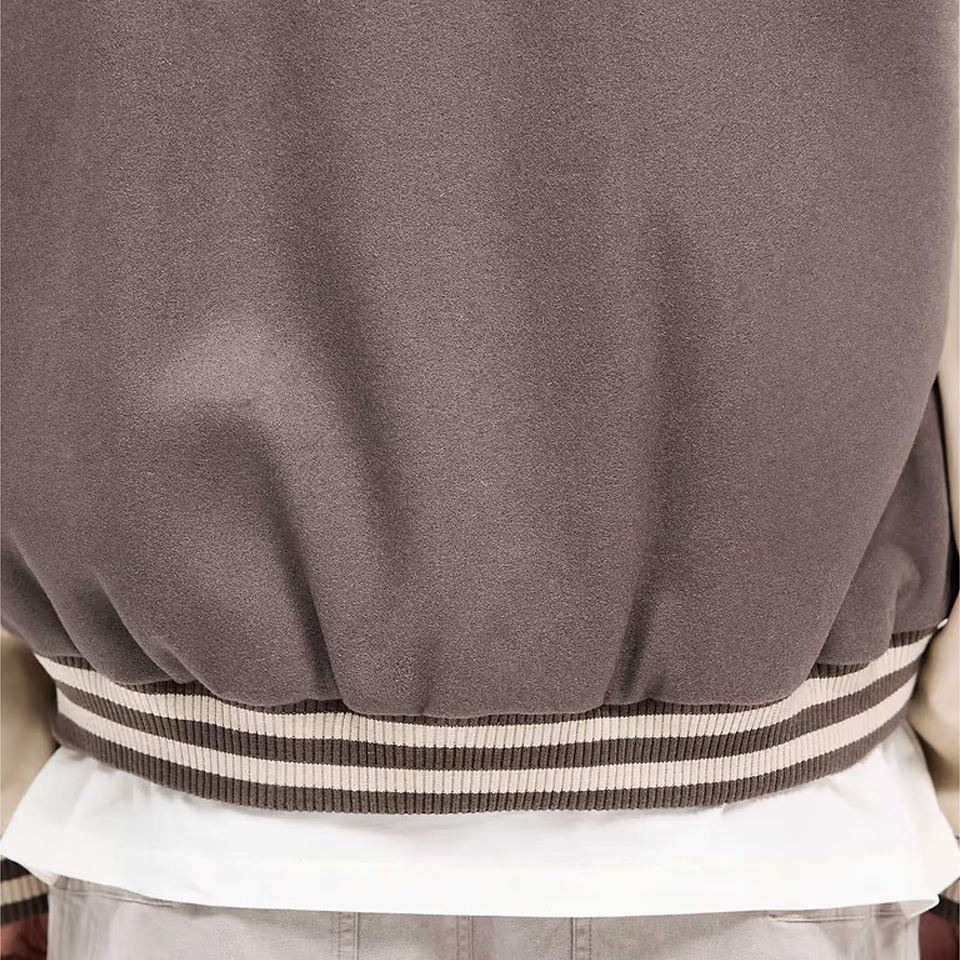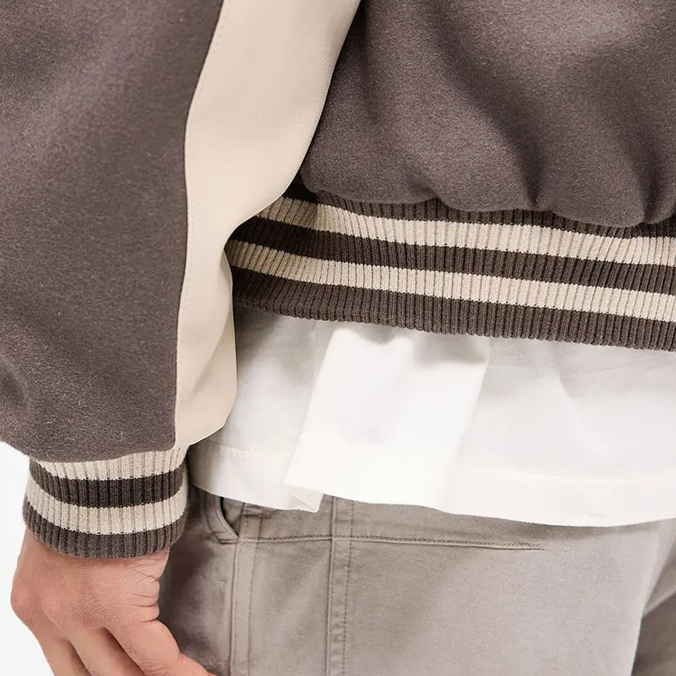 เสื้อแจ็กเก็ตเบสบอลของผู้ชายเสื้อโค้ทขนสัตว์แขนเสื้อหนังสำหรับฤดูหนาวออกแบบได้ตามต้องการ