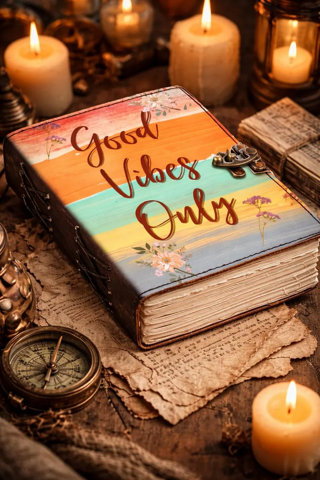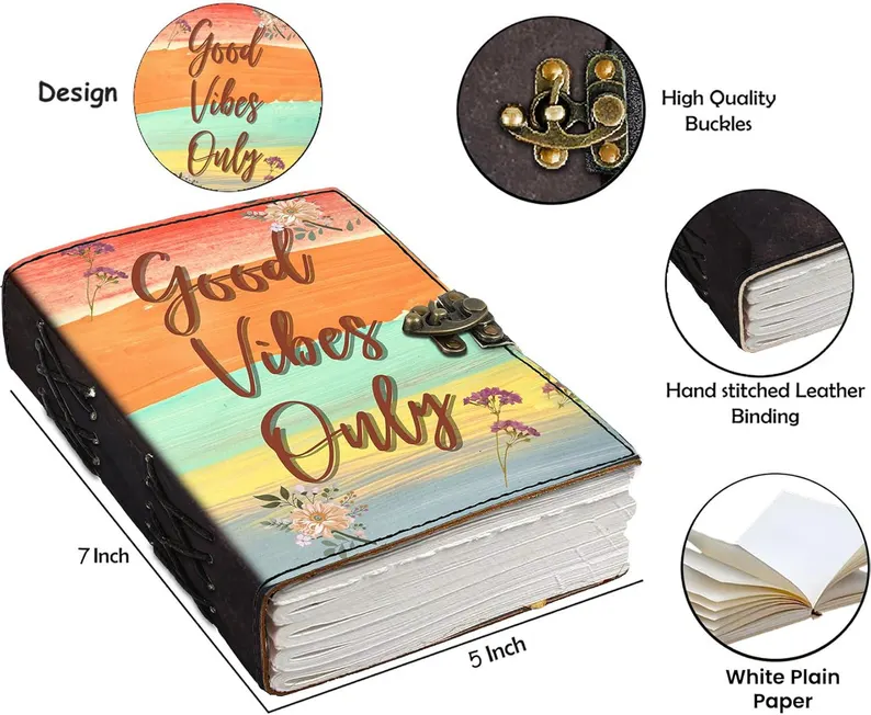 สมุดบันทึกปกหนังแข็ง Good Vibes Only ลายดอกไม้สไตล์โบโฮ ทำมือ พิมพ์ลาย UV สมุดจดบันทึกสร้างแรงบันดาลใจ ของขวัญสุดน่ารัก