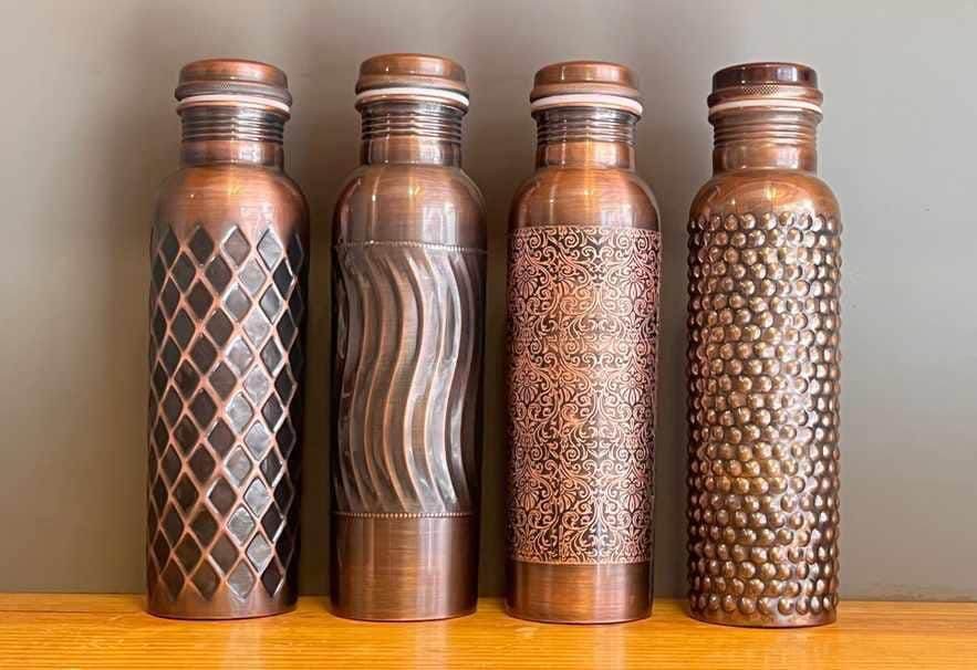 ดูดีแกะสลักขวดน้ําทองแดงบริสุทธิ์ 100% 34 ออนซ์ - เรือ Ayurvedic ป้องกันการรั่วขวดน้ําทองแดงตอก