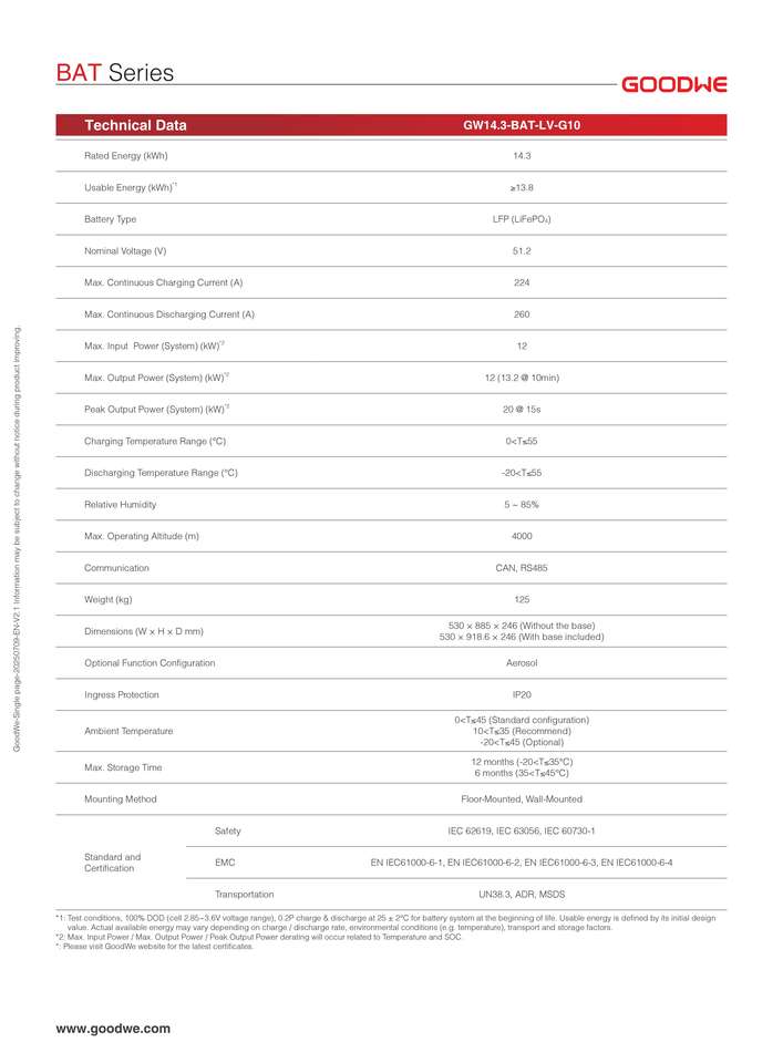 Goodwe ชุดแบตเตอร์รี่ GW14.3-BAT-LV-G10 14.3kwh LiFePO4 51.2V 280Ah GOODWe ชั้นวางแบตเตอรี่ลิเธียมไอออน goodwe