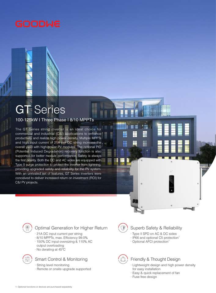 Goodwe GT ชุดอินเวอร์เตอร์100KW 125KW 110KW สามเฟสเชื่อมต่อตาราง IP66ระบบตรวจสอบอัจฉริยะเกรดอุตสาหกรรมเชิงพาณิชย์