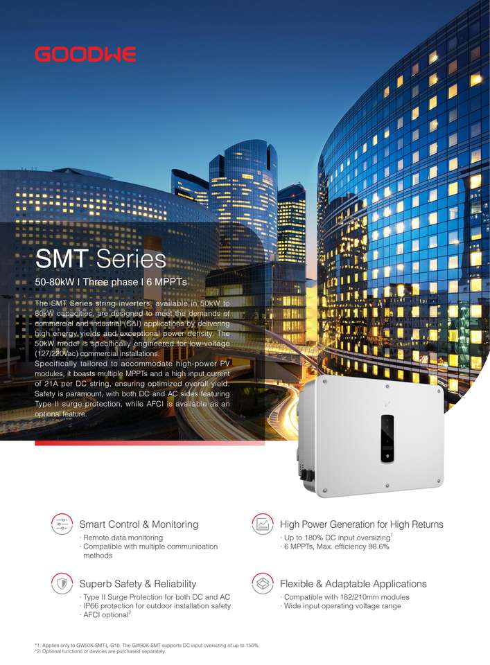 Goodwe GW80K-SMT อินเวอร์เตอร์สำหรับผูกกริดสามเฟส IP66 80KW ได้รับการจัดอันดับ98.6% ประสิทธิภาพที่ออกแบบมาสำหรับพลังงานแสงอาทิตย์อุตสาหกรรมเชิงพาณิชย์