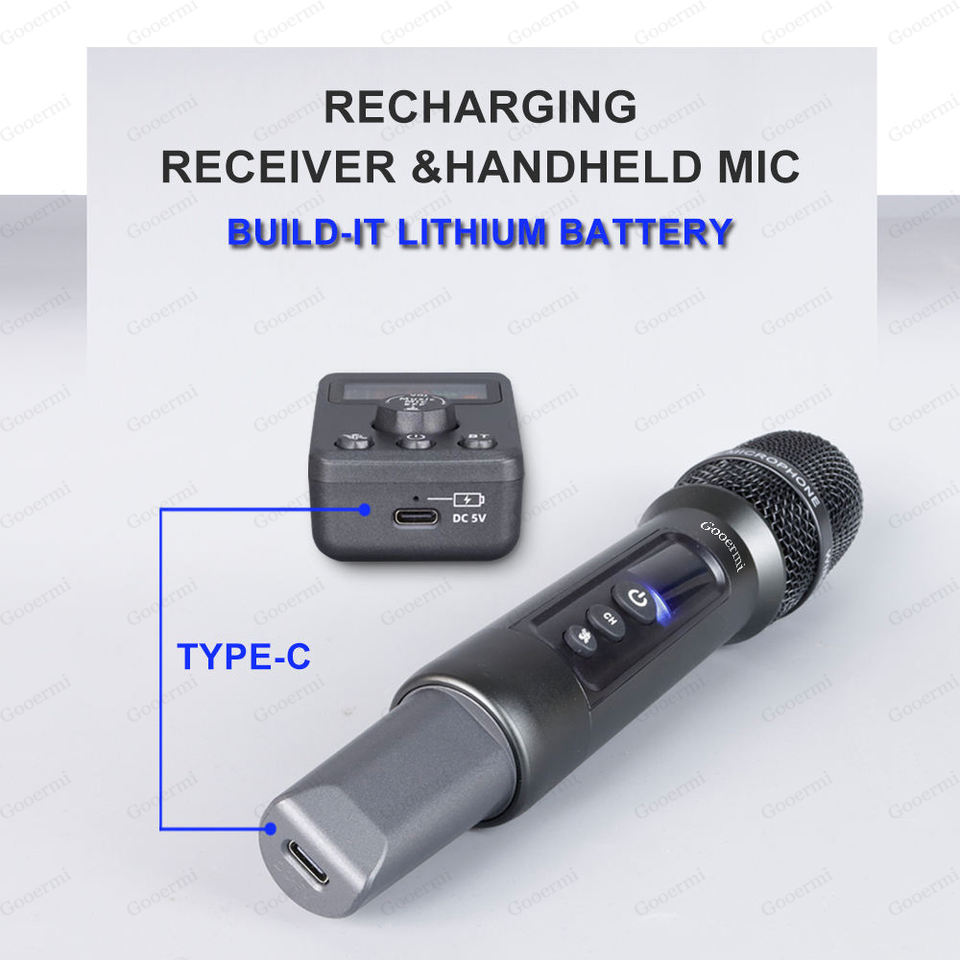 ไมโครโฟนไร้สายมือถือระดับมืออาชีพ Gooermi-K01 พร้อมตัวรับสัญญาณ ปุ่มเมนู ปุ่มเปิดปิด สำหรับการร้องเพลงบนเวที