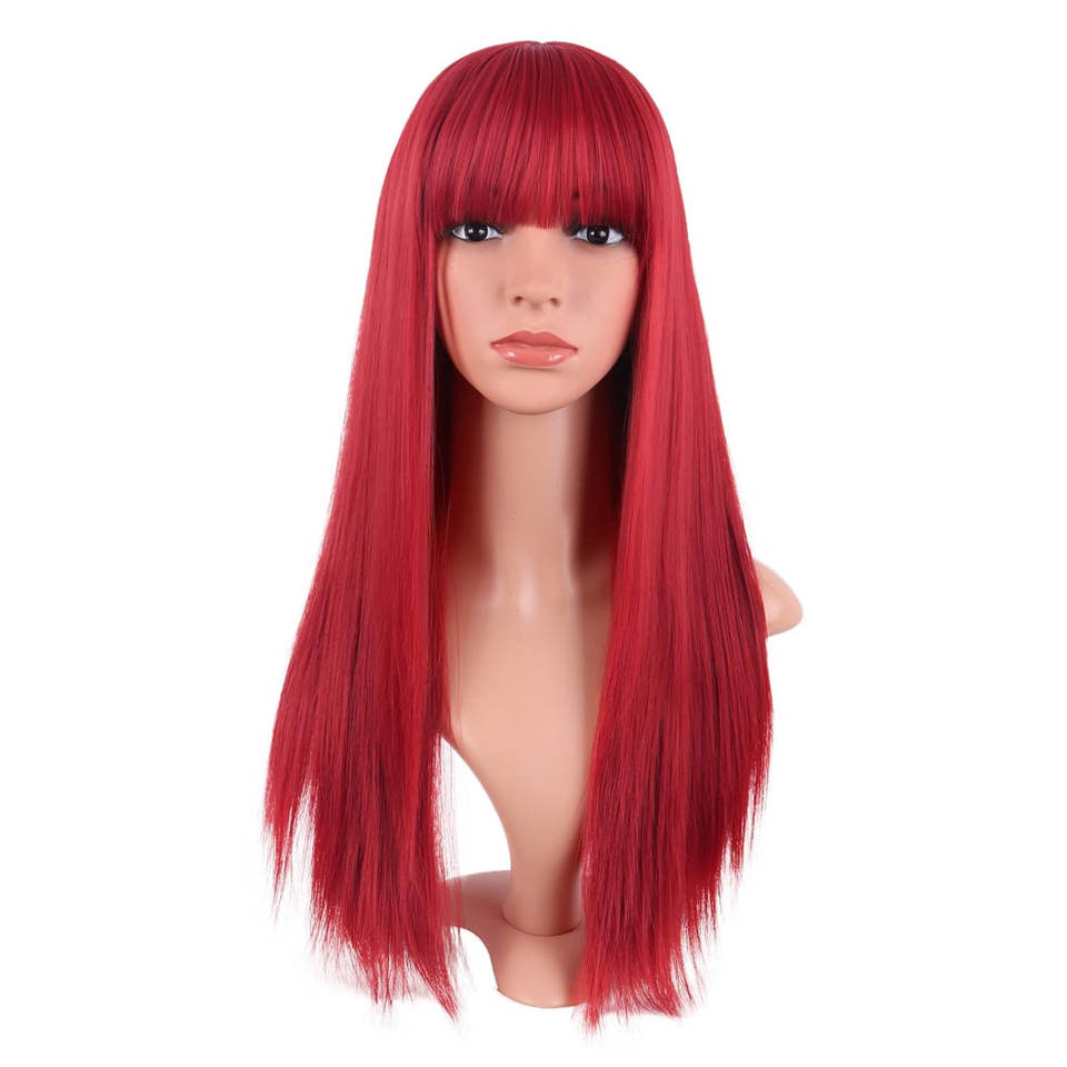 วิกผมยาวตรงสำหรับผู้หญิงวิกใยสังเคราะห์ทนความร้อนมีผมม้าเรียบเหมาะสำหรับเครื่องแต่งกายสีแดง