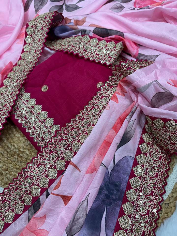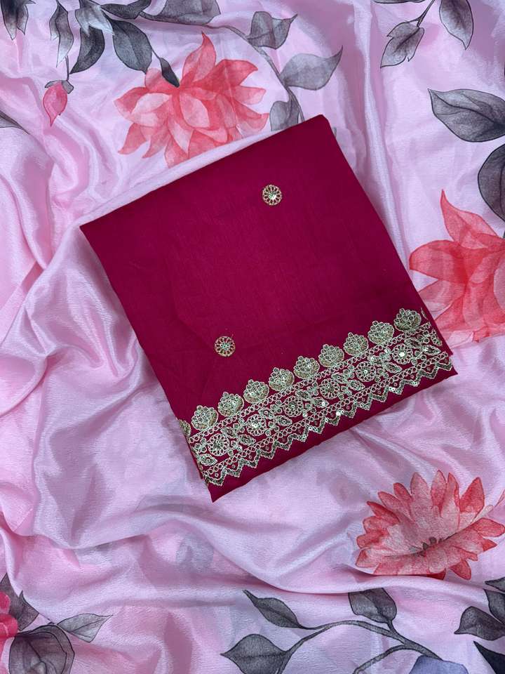Product Name:Chinon Silk With Floral Print And Sequins Embroidery Lace Saree