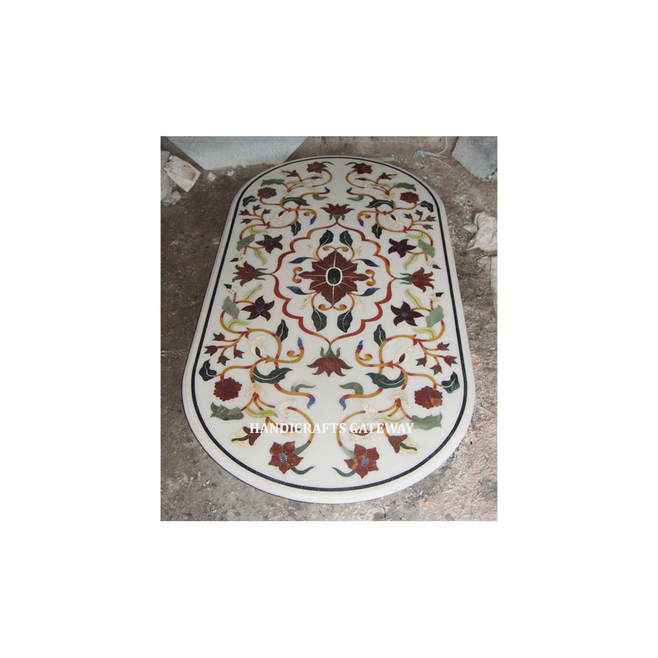 หินอ่อนสีขาวฝังบนโต๊ะทำมือรูปทรงสวยงามสวยงามขัดละเอียดสำหรับตกแต่งบ้านดีไซน์ดอกไม้สวยงาม