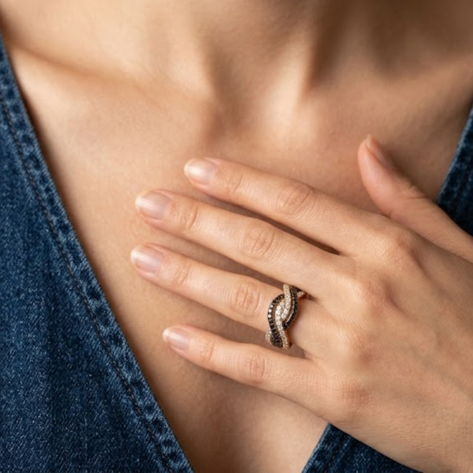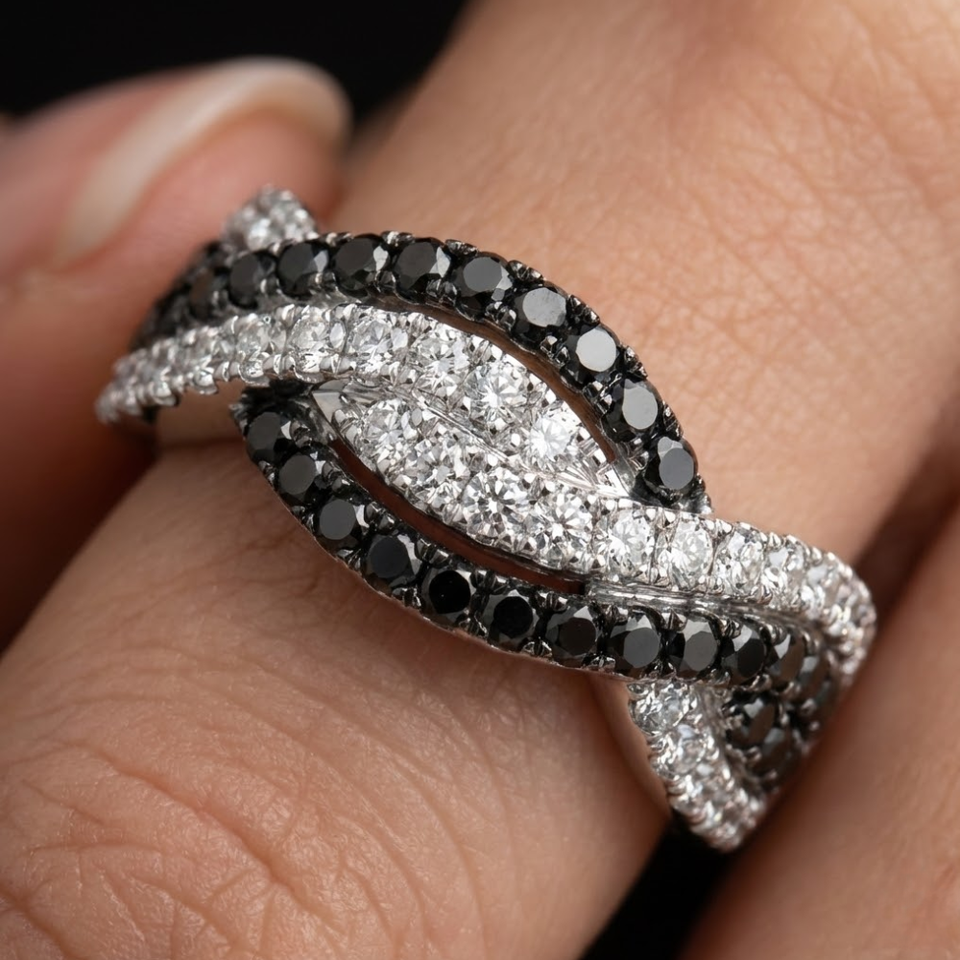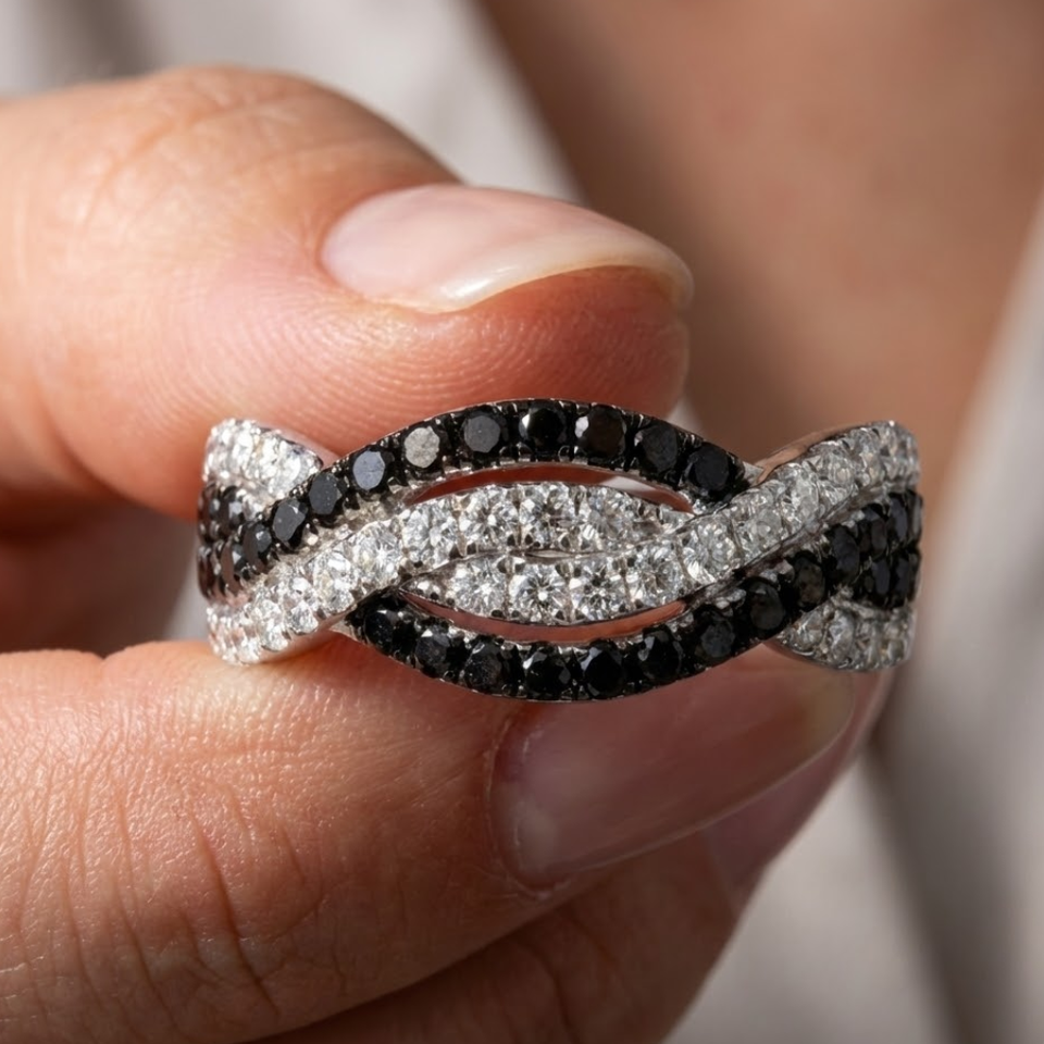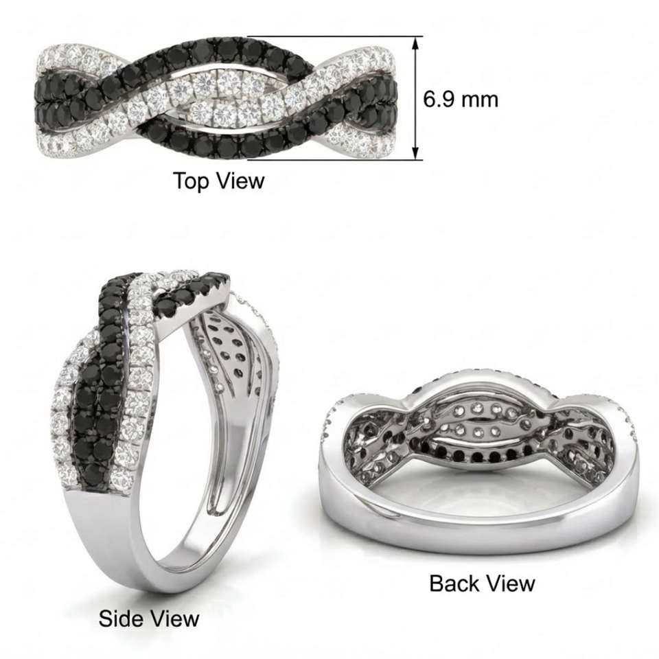 แหวนแต่งงานทองคำขาว 18k ดีไซน์คลาสสิกประดับเพชรดำทรงบิดเกลียว สวยหรูและประณีต