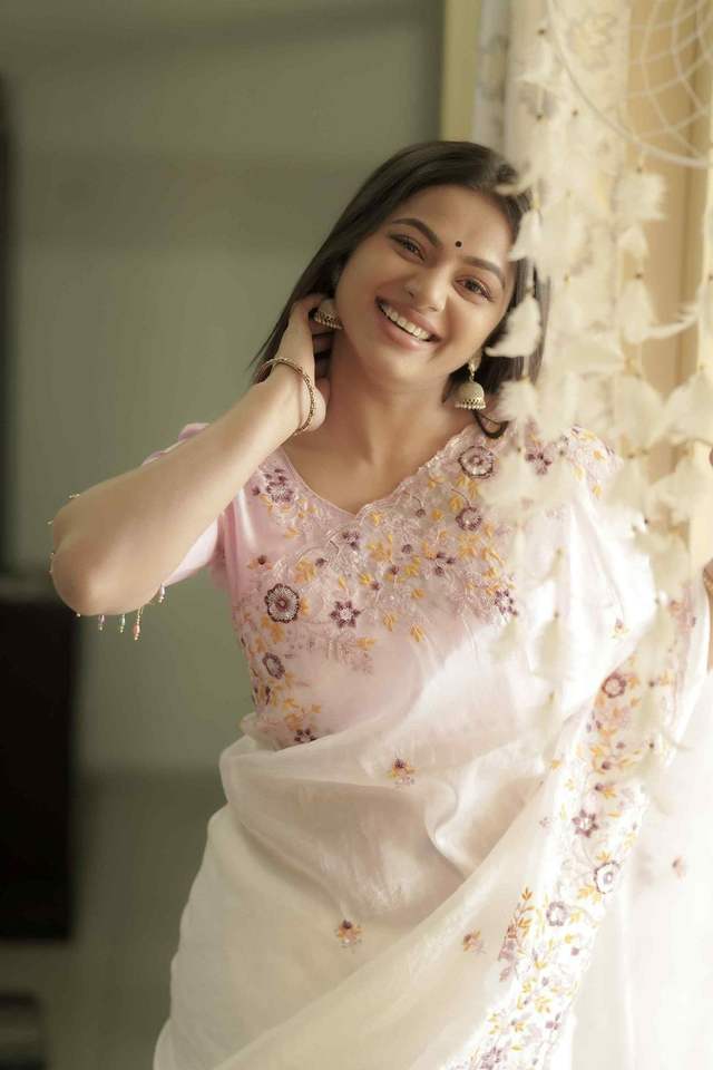 เสื้อส่าหรีผ้าไหมสีขาวสุดพิเศษสำหรับเจ้าสาวชุดปาร์ตี้ชาติพันธุ์สุดหรูสีทองบดแบบเรียบล่าสุด