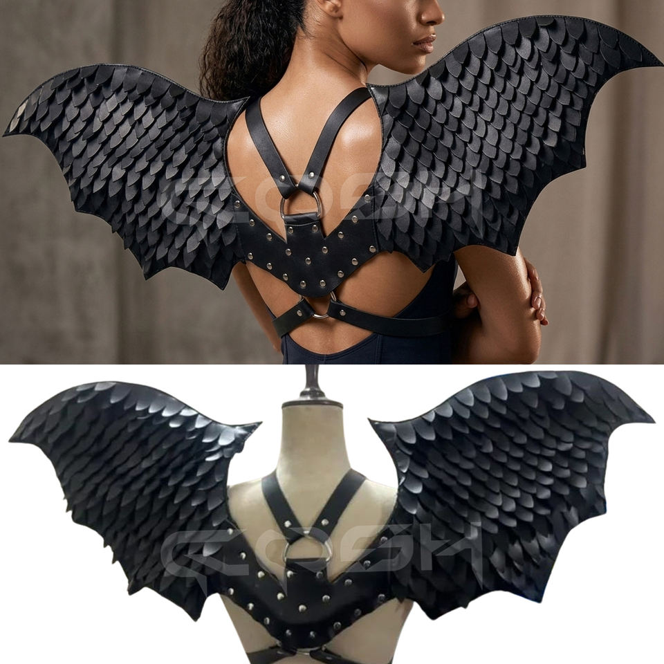 ชุดรัดตัวหนังเทียมสีดำแบบปรับได้สไตล์โกธิค พร้อมปีกหนังมังกรแบบหลายชั้น สำหรับคอสเพลย์และชุดแฟนซี