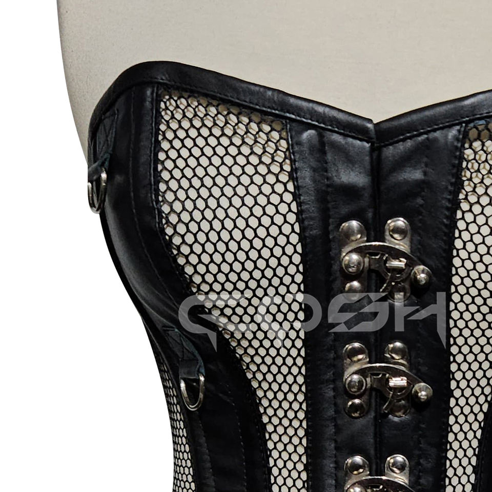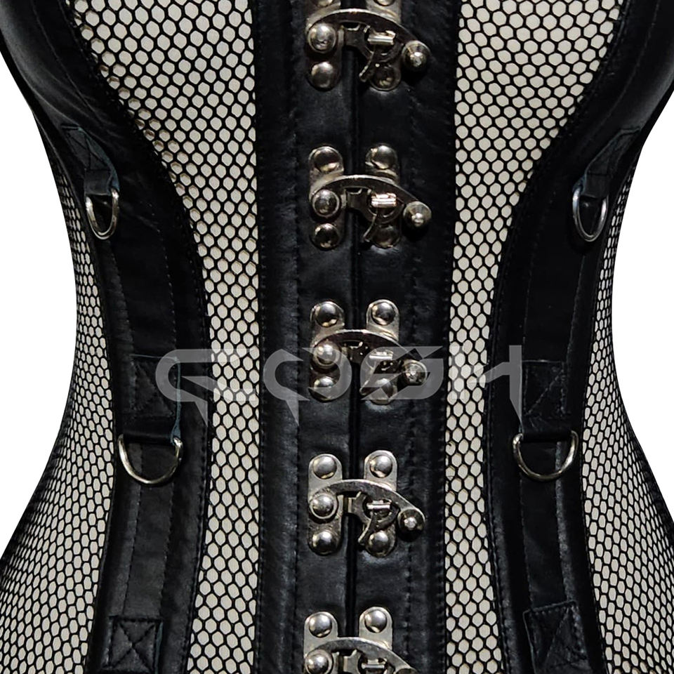 ชุดกระชับสัดส่วนหนังสีดำสไตล์โกธิค ตาข่ายเสริมโครงเหล็ก แบบรัดเอว สำหรับออกกำลังกาย แบบพังก์ร็อก ติดกระดุมด้านหน้า ผู้ผลิตบัสติเยร์คอร์เซ็ท