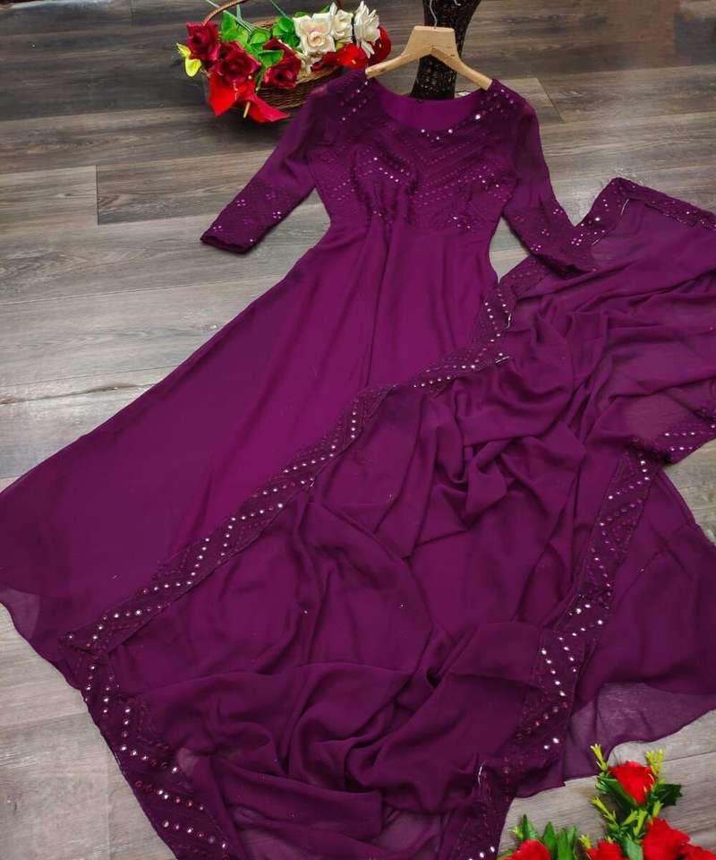 ชุดกาวน์กับ dupatta ออกแบบล่าสุดจากดีไซเนอร์อินเดียผ้าจอร์เจียแบบปักสำหรับทำงานผลิตเสื้อผ้าชาติพันธุ์