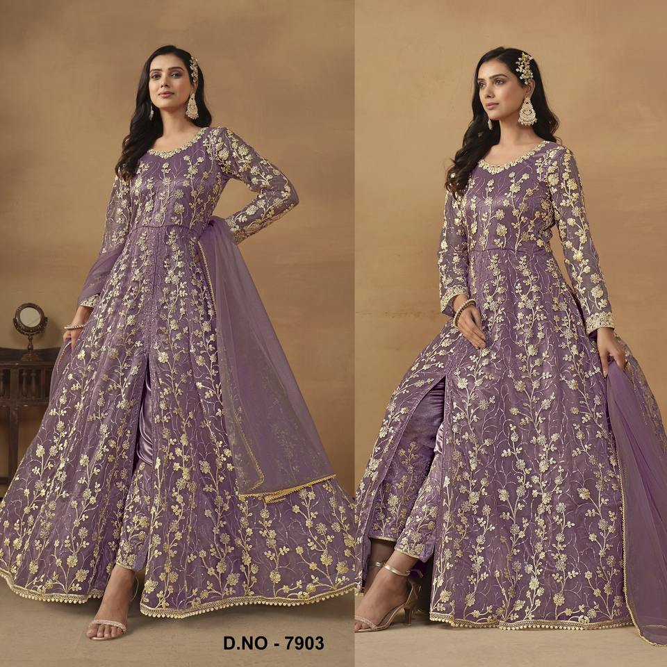 Anarkali ที่สง่างามในตาข่ายผีเสื้อหนักที่มีลำดับที่น่าทึ่งและงาน codding กึ่งเย็บด้วย Flair แบบหรูหรา