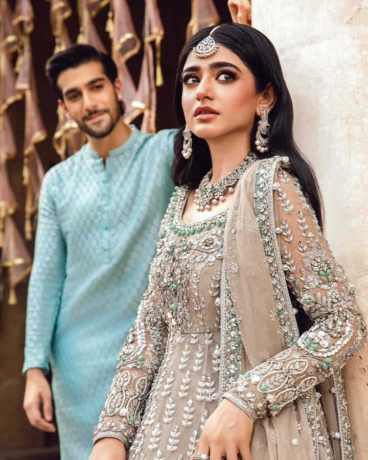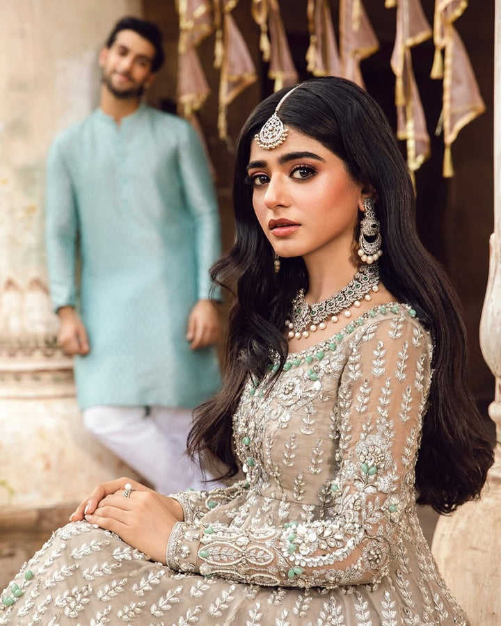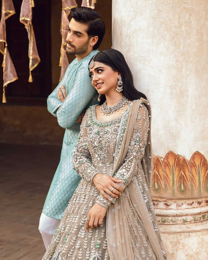 ชุดเจ้าสาวสไตล์ปากีสถานที่ทันสมัยและสง่างาม พร้อมงานปักด้วยด้ายซารีคุณภาพสูง ดีไซน์ลูกไม้ที่สร้างลุคเจ้าสาวที่หรูหราและสง่างามด้วยความยาวระดับพื้น