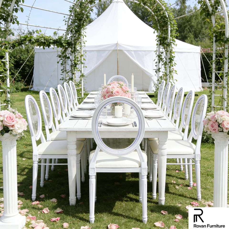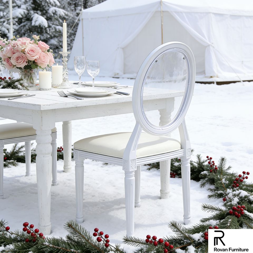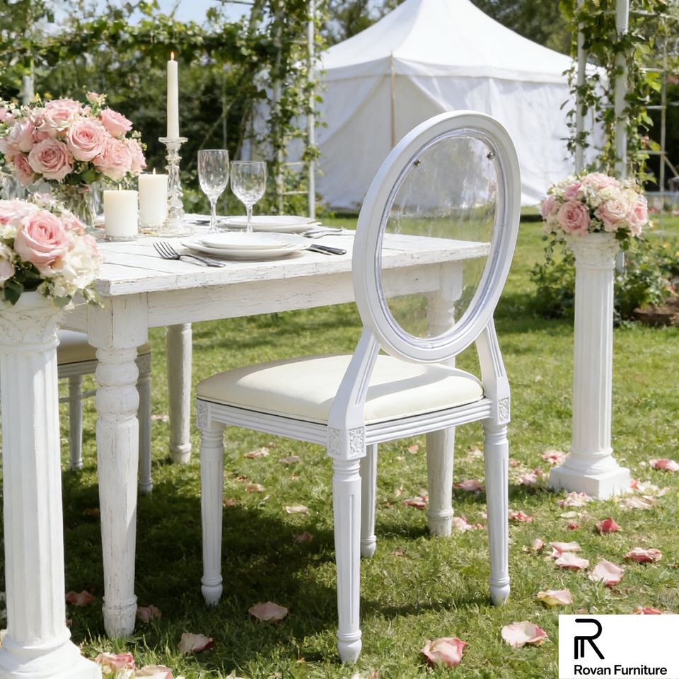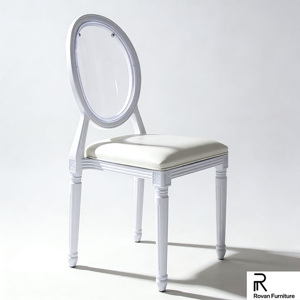 เฟอร์นิเจอร์งานแต่งงานทันสมัยสวยงาม เก้าอี้หลุยส์พนักพิงกลมสีขาว เก้าอี้เรซิ่นพลาสติกแบบโมโนบล็อก วางซ้อนกันได้ มีจำหน่ายให้เช่า