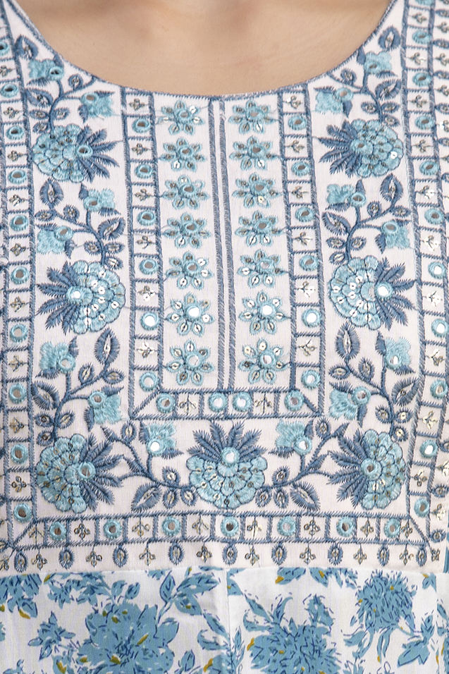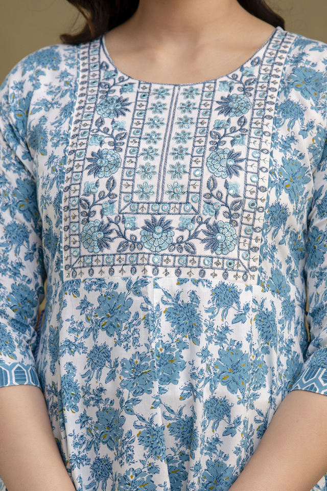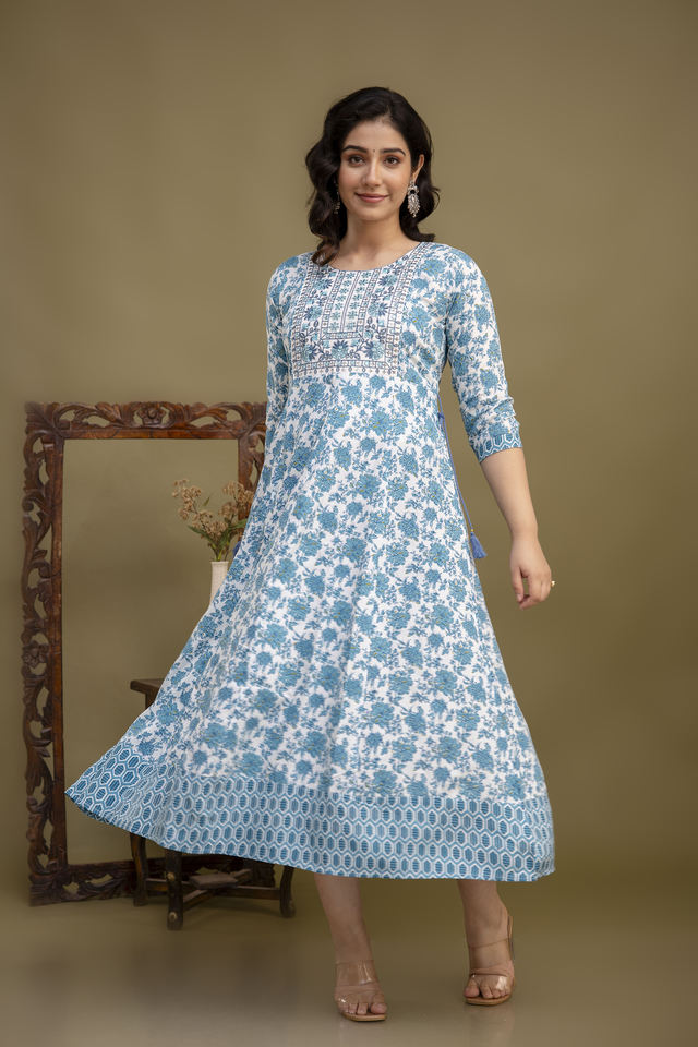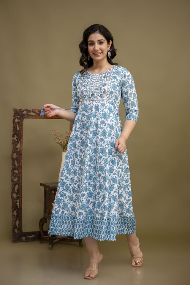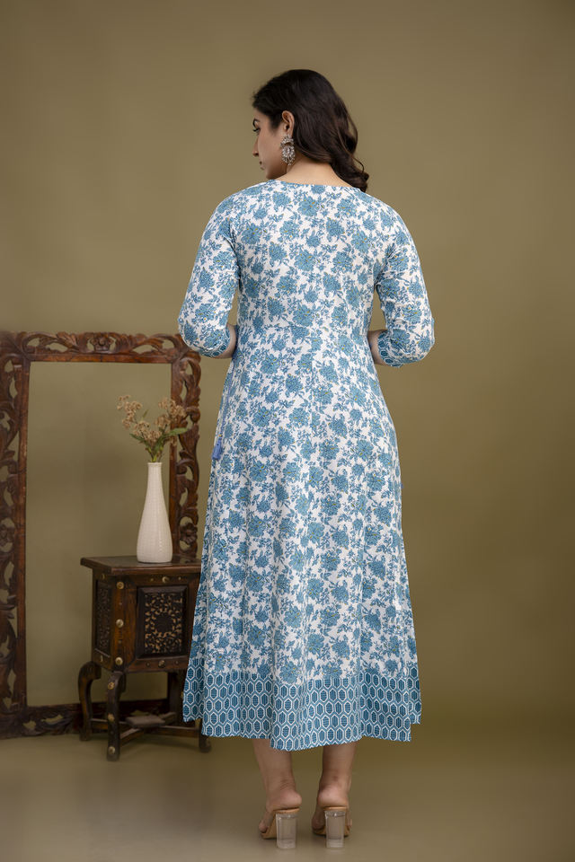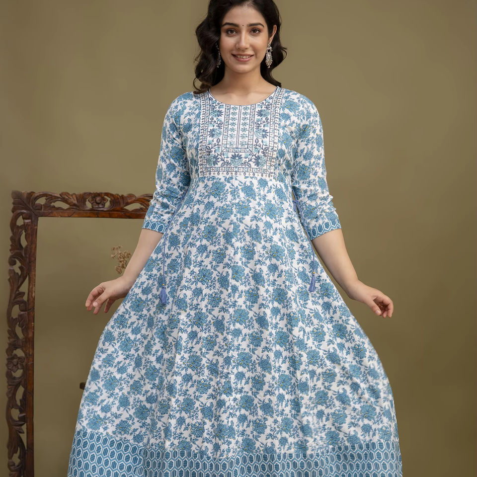 สง่างามและเหนือกาลเวลา ชุดอนาร์กาลีลายดอกไม้สีน้ำเงินนี้ ผสมผสานความงดงามแบบดั้งเดิมและความสง่างามในชีวิตประจำวันได้อย่างลงตัว นุ่มสบายและระบายอากาศได้ดี