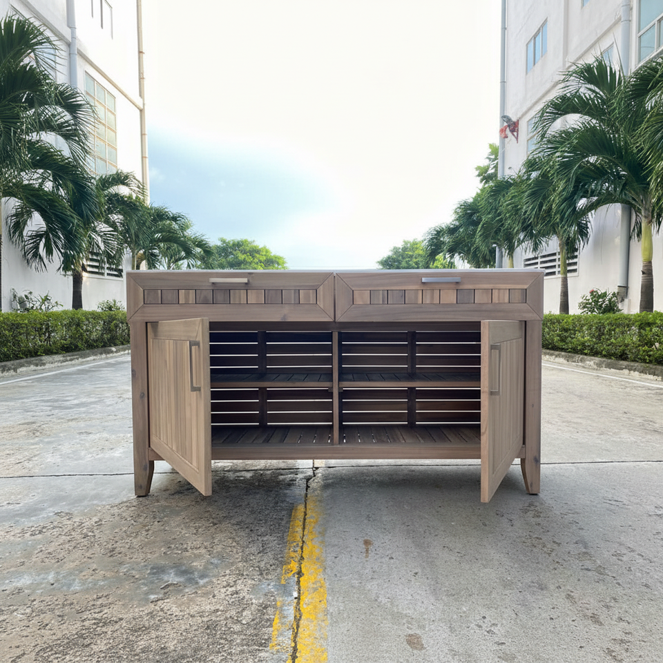 ชั้น-ไม้สักกลางแจ้งลานบ้านสวนตู้เก็บอกสำหรับห้องครัวในสวนที่มีประตูคู่และกันน้ำ